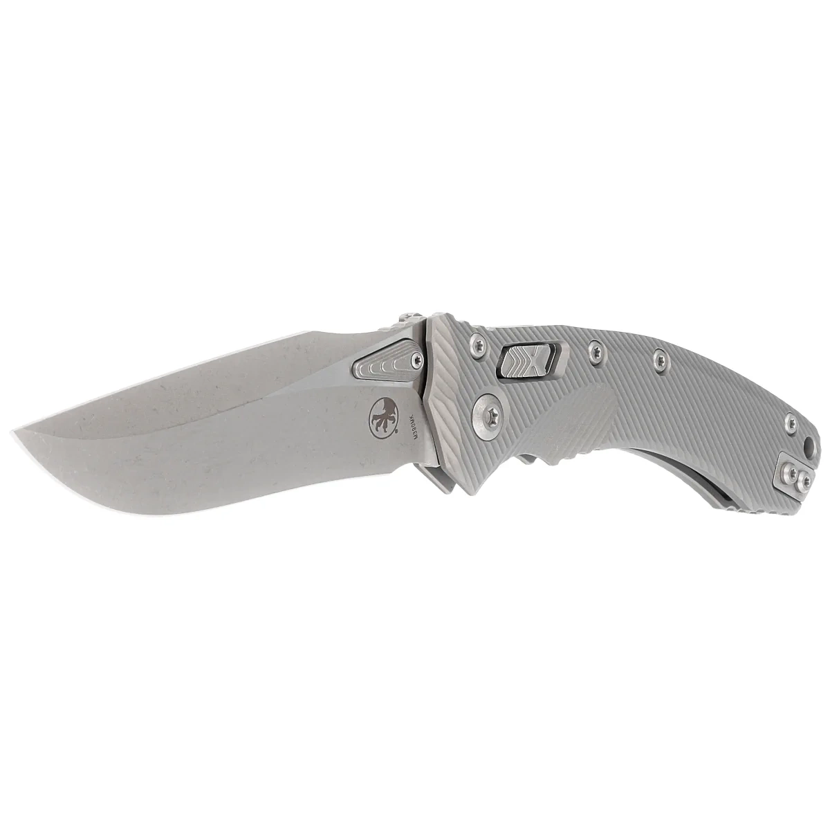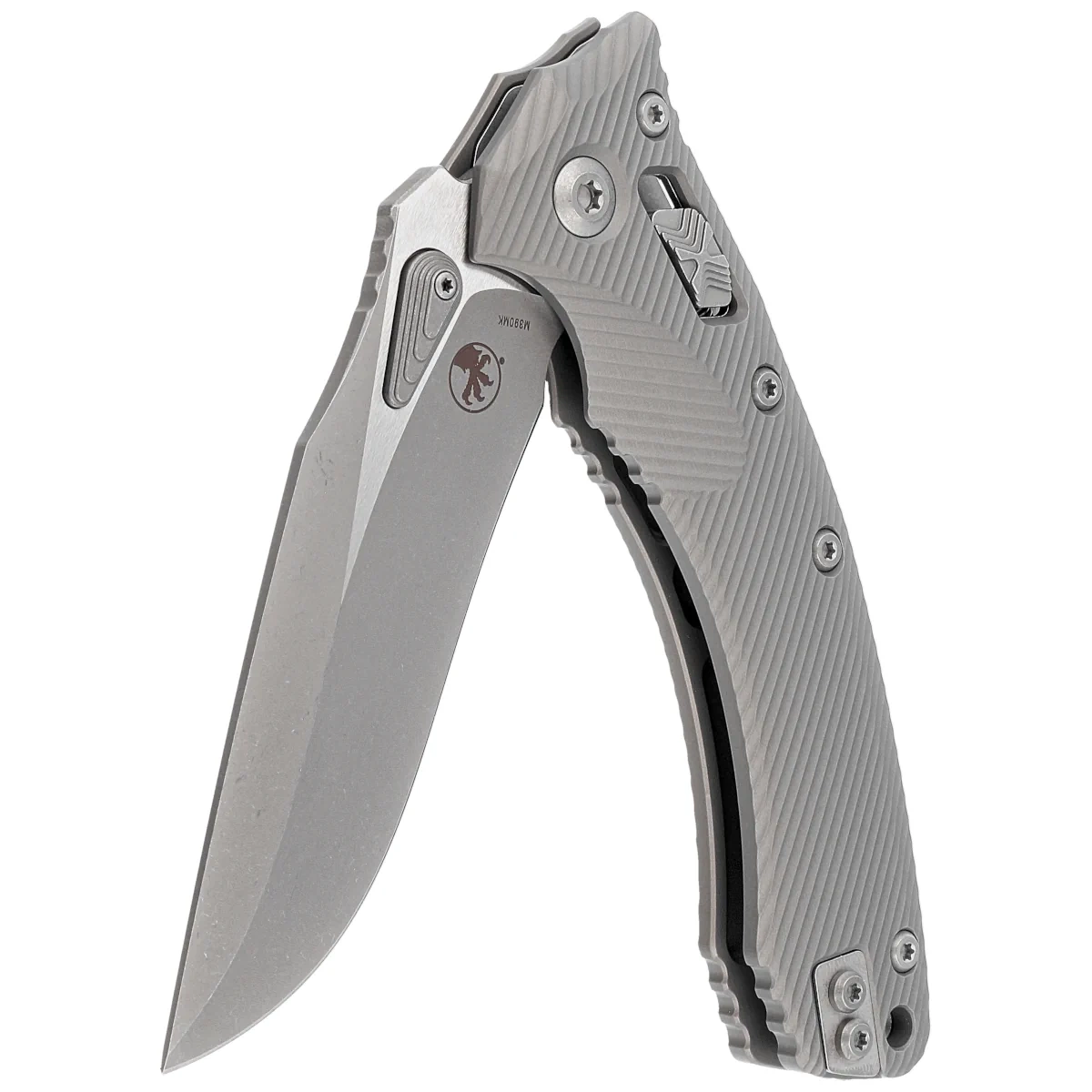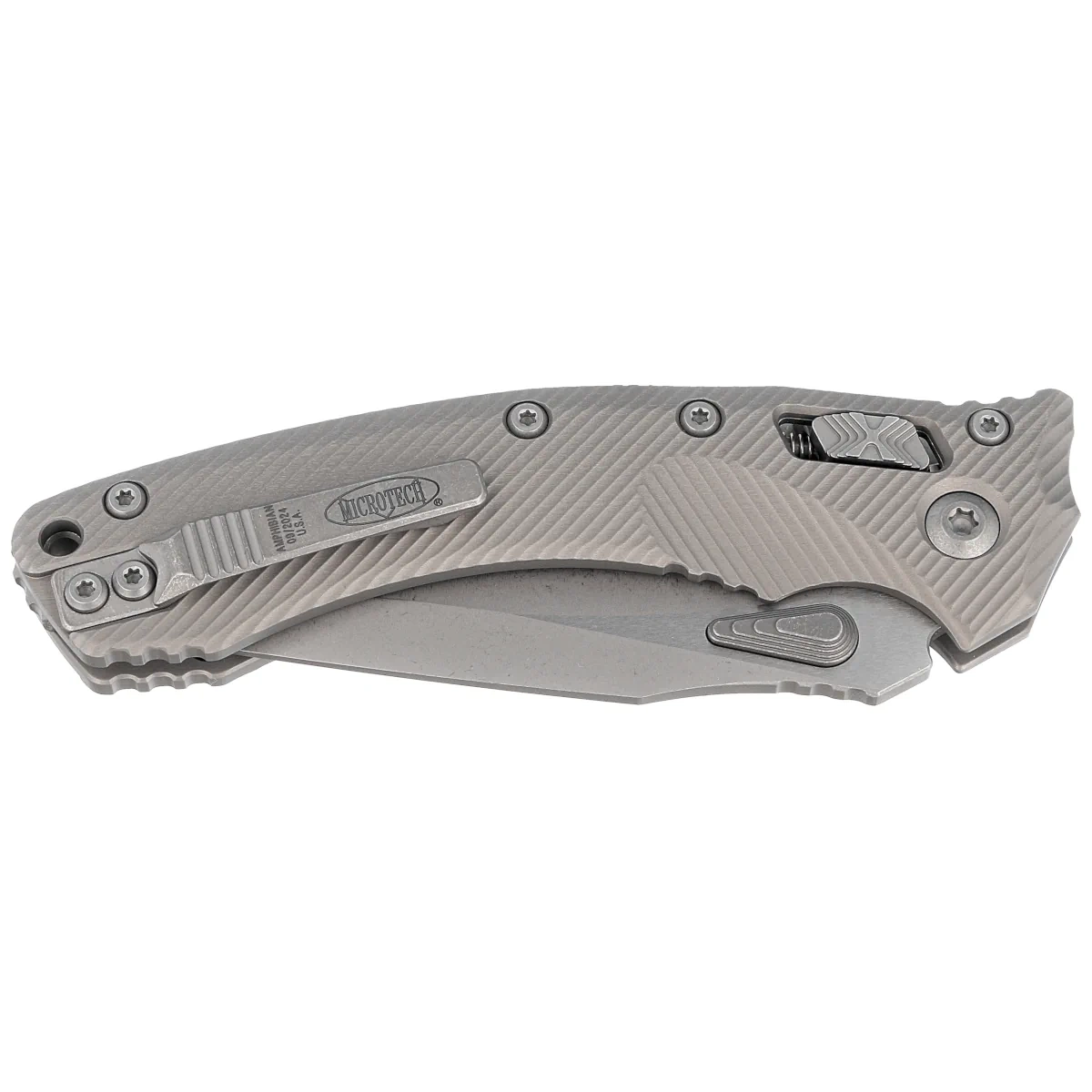 Rękojeść - wykonana z doskonałą precyzją w technologii 3D na frezarkach CNC, ze szczotkowanego i polerowanego aluminium 6061-T6, dla lepszego uchwytu pokryta wyfrezowanymi liniami (Fluted). Szeroki suwak blokady z charakterystyczną dla firmy Microtech schodkową strukturą X. Obie okładziny zostały skręcone przy pomocy solidnego, backspacera. Dwustronny (prawa / lewa) tytanowy klips pozwala dyskretnie nosić nóż w pozycji tip-up. Nad klipsem lanyard hole, miejsce na linkę zabezpieczającą lub ozdobną.