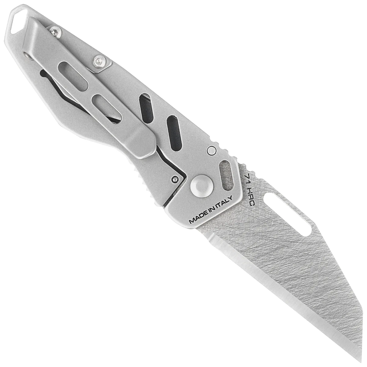 Głownia - typu Wharncliffe o pełnym płaskim szlifie (Full Flat Grind). Surowe wykończenie (Sandblast) - jego efektowny wygląd uzyskano poprzez piaskowanie PTC drobnym piaskiem. W przeciwieństwie do klingi ze stali, ostrze PTC jest całkowicie odporne na rdzę, dzięki czemu nadaje się zarówno do pracy w słodkiej jak i słonej wodzie. Głownię można otworzyć za pomocą otworu w klindze (thumb hole). Dzięki temu mogą z niego bez problemu korzystać osoby prawo i leworęczne. Całość blokowana jest sprawdzoną blokadą Frame Lock.