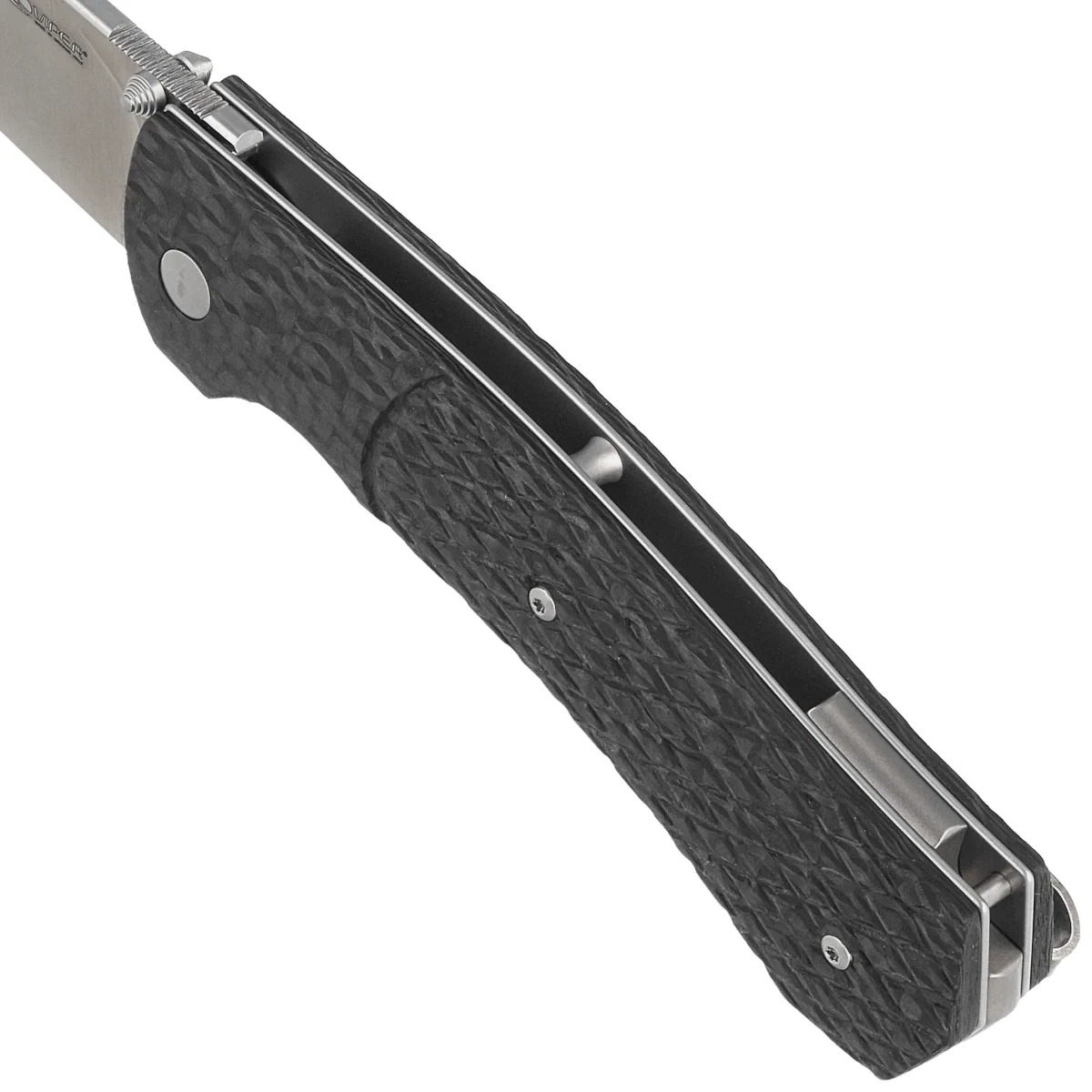 Safe Carbon Fiber, Satin niezwykły nóż składany E.D.C., zaprojektowany przez Fabrizio Silvestrellego, skierowany do najbardziej wymagających odbiorców. Wykonany z najwyższej jakości materiałów przez doświadczonych rzemieślników z Maniago, łączy tradycję, użyteczność i nowoczesne technologie konstrukcyjne. Rękojeść z kompozytu Carbon Fiber o stonowanym wyglądzie dodającym elegancji. Głownia wykonana z uznawanej za jedną z najlepszych stali na noże Böhler M390, znanej z wytrzymałości i długiego trzymania ostrza. System Automatic Safe Lock System, zabezpiecza blokadę liner lock, zapewniając bezpieczne cięcie, bez względu na to, jak bardzo go obciążasz. Wyjątkowa funkcjonalność, piękny wygląd, prawdziwe dzieło sztuki użytkowej, które łączy w sobie najlepsze cechy tradycyjnego rzemiosła z nowoczesnymi technologiami. Bez wątpienia, jest to nóż, który zasługuje na miejsce w kolekcji każdego miłośnika noży.