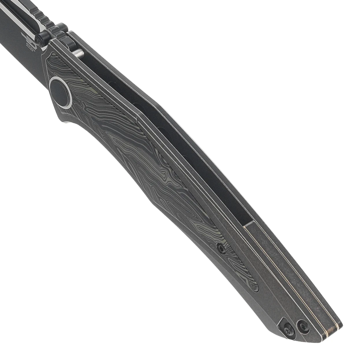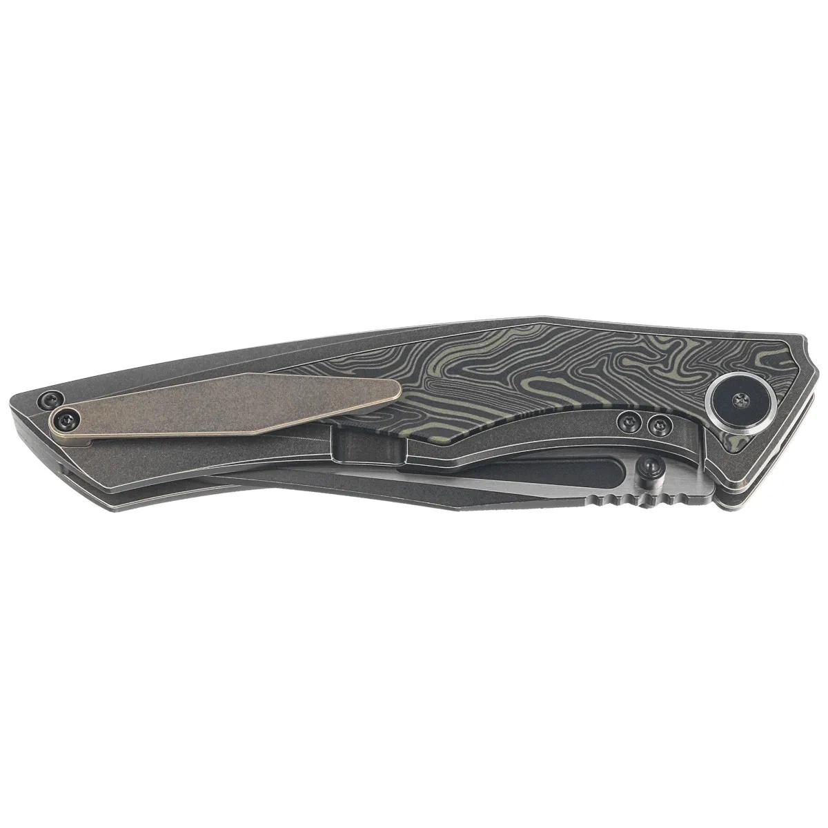 Rękojeść - z litego tytanu 6AL4V z idealnie wkomponowaną wkładką z dwukolorowego kompozytu G10. Fazowane krawędzie okładek eliminują ostre ranty dla wygody i poprawiają pewność uchwytu. Masywny tytanowy backspacer do którego przymocowano okładziny gwarantuje sztywność i wytrzymałość całej konstrukcji. Jednopozycyjny, prawostronny tytanowy klips umożliwia przenoszenie noża w pozycji tip-up, czubkiem ostrza ku górze.