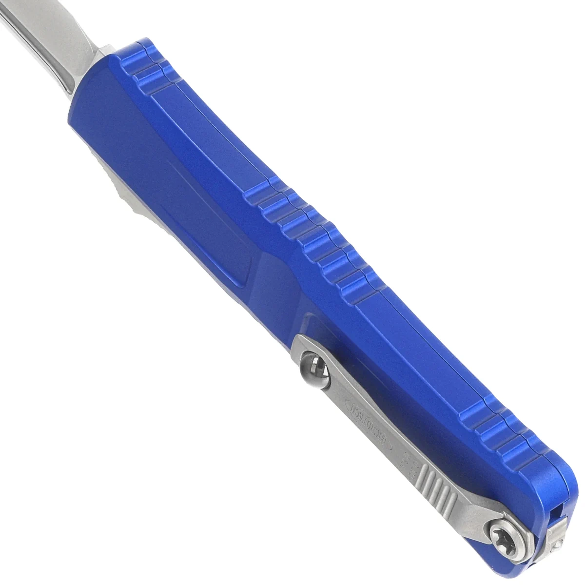Rękojeść - wykonana z doskonałą precyzją w technologii 3D na frezarkach CNC, z pokrytego powłoką Mil-Spec aluminium 6061-T6. Faktura powierzchni rękojeści oraz głębokie nacięcia (jimping) na niej sprawiają, że nóż nie ślizga się w dłoni podczas używania. Smukły profil oraz frezowany dwupozycyjny (prawa/lewa) masywny klips typu deep carry, umożliwiają dyskretne przenoszenie noża w kieszeni, w pozycji tip-down (czubkiem ostrza do dołu). Wyposażony w gładką kulkę rollerball, dzięki której nóż z łatwością wsuwa się do kieszeni nie niszcząc brzegów kieszeni. Na klipsie znajduje się logo Microtech i data produkcji. Rękojeść zakończono zbijakiem do bicia szyb, stalowy trójkąt, w który wprasowano kulkę z węglika wolframu.