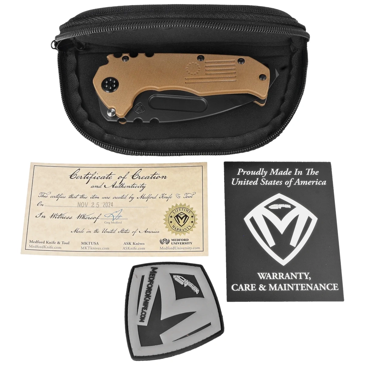 Greg Medford, założyciel Medford Knife and Tool, to amerykański rzemieślnik i patriota z Arizony. Jego grecko-irlandzkie korzenie i wartości, które wpoiła mu rodzina, takie jak pragmatyzm i ciężka praca kształtowały jego drogę innowacyjnego projektanta. Jako były żołnierz piechoty morskiej, pilot i mistrz sztuk walki, Greg łączy w swoich projektach amerykańską pragmatyczność, wolność i zaawansowaną technologię. Firma, założona w 2010 roku, słynie z ręcznie robionych, trwałych narzędzi taktycznych i noży, w tym znanego modelu Praetorian
