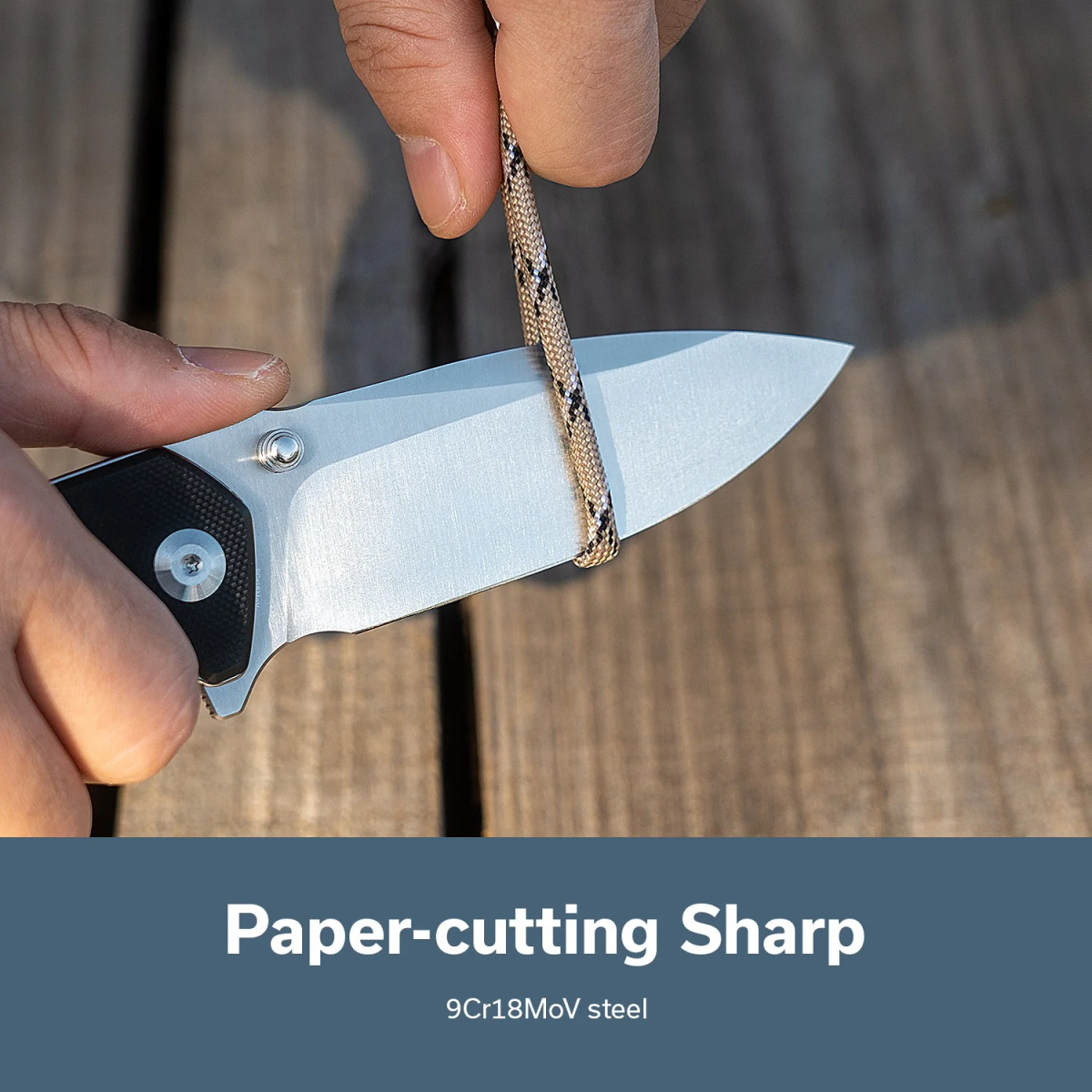 Głownia - typu Drop Point, wykończona eleganckim satynowaniem. Niewielka grubość klingi w połączeniu z wysokim, płaskim szlifem daje doskonałą geometrię krawędzi tnącej oraz ekstremalną wydajność cięcia. Ceramiczne łożyska kulkowe wspomagają płynną pracę mechanizmu otwierającego klingę, którą można otworzyć za pomocą szybkiej płetwy flippera (index-finger flipper). Po otwarciu płetwa tworzy mini-gardę zapobiegającą ześlizgnięciu się dłoni na ostrze. Nóż można również otworzyć przy pomocy obustronnego kołka w klindze. Na grzbiecie klingi upper jimping, karbowane oparcie pod kciuk. Całość blokowana jest solidną blokadą liner lock.