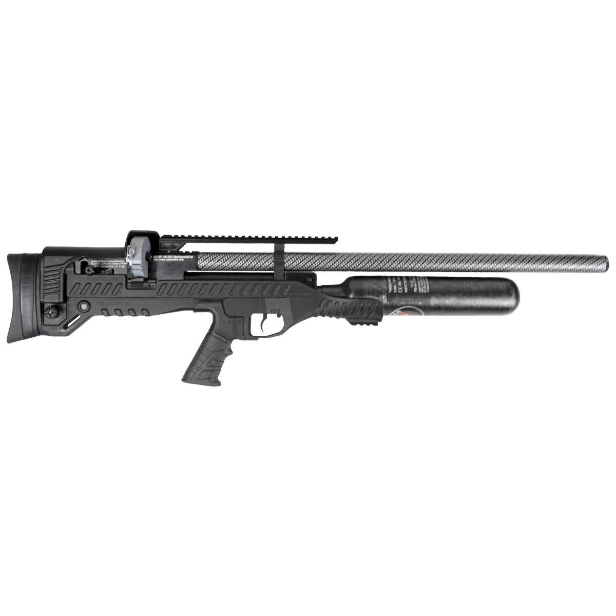 Zasilanie - stały zasobnik sprężonego powietrza z włókna węglowego o pojemności 580 cc (carbon fiber air tube bottle). W pełni naładowany kartusz pozwala na oddanie od 100 do 130 efektywnych strzałów w zależności od kalibru wiatrówki (dane dla wersji FAC*). Manometr pozwala na bieżąco kontrolować ciśnienie znajdujące się w zbiorniku, a tym samym stopnień jego naładowania. 130 bar minimalne ciśnienie robocze w kartuszu niezbędne do prawidłowego działania wiatrówki z systemem Full Auto i Semi Auto Action zalecane przez producenta. Ze względu na dużą pojemność ładowanie kartusza wyłącznie z butli technicznej lub nurkowej (300 bar).