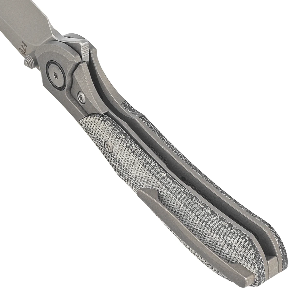 Rękojeść - z litego tytanu 6AL4V z idealnie wkomponowaną wkładką z kompozytu Micarty. Fazowane krawędzie okładek eliminują ostre krawędzie dla wygody, a podcięcie na palec (fore finger groove) poprawia pewność uchwytu. Tytanowy backspacer do którego przymocowano okładziny gwarantuje sztywność i wytrzymałość całej konstrukcji. Jednopozycyjny, prawostronny tytanowy klips umożliwia przenoszenie noża w pozycji tip-up, czubkiem ostrza ku górze.
