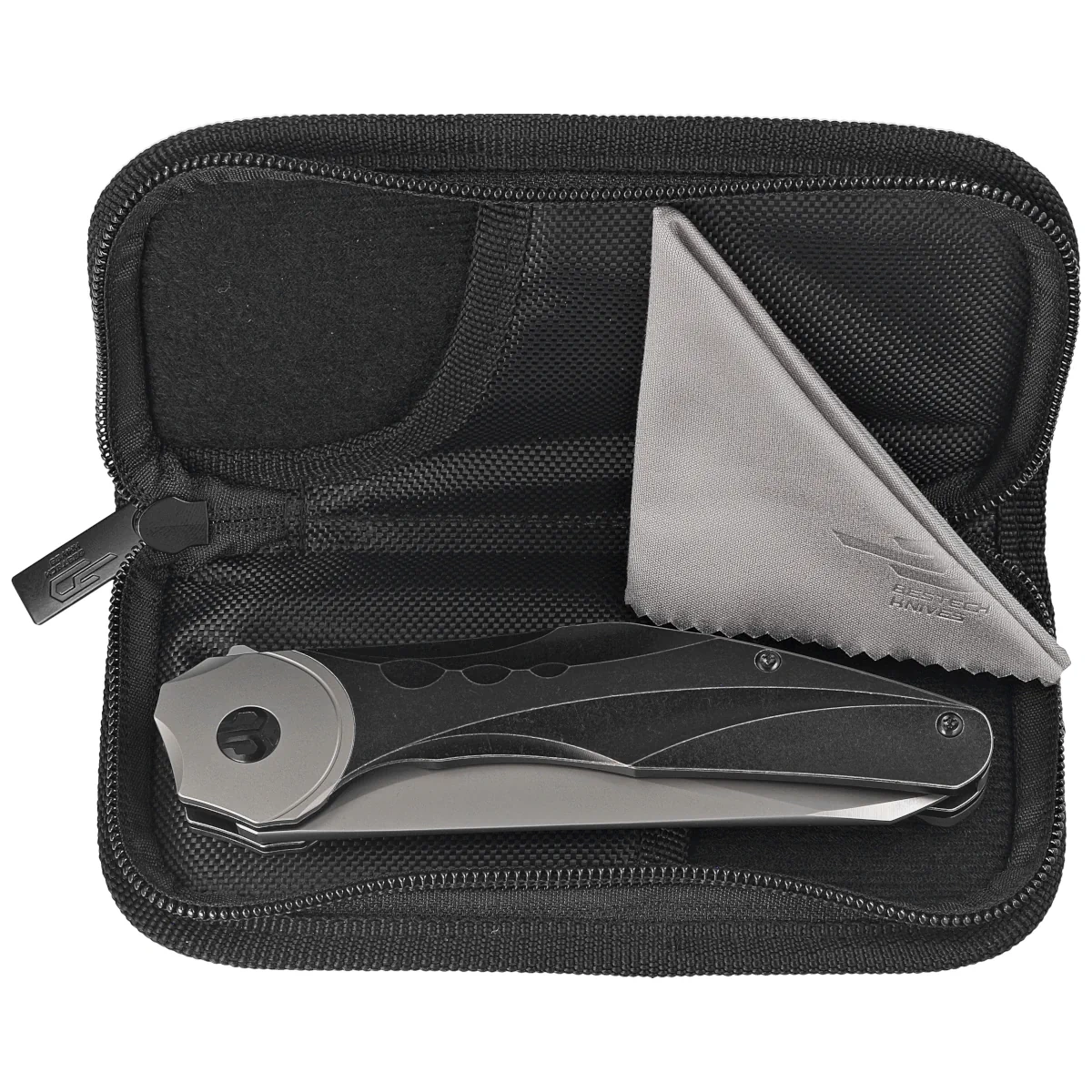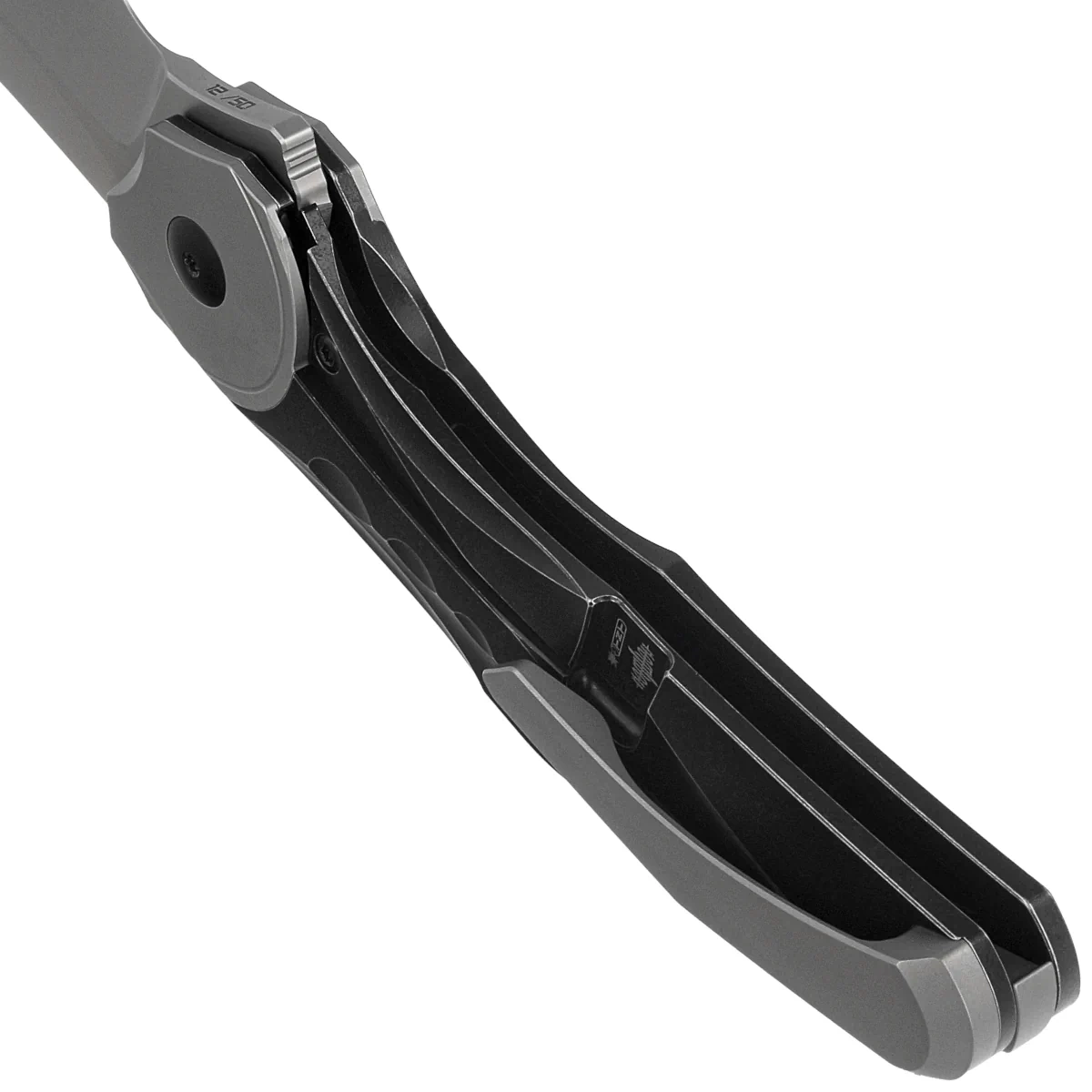 Rękojeść - z frezowanego tytanu 6AL4V, fazowane krawędzie okładek eliminują ostre krawędzie. Całość przykręcona do solidnego backspacera, również wykonanego z tytanu. Oś pivota zdobi bolster z tytanu w kontrastowym kolorze. Podcięcie na palec (fore finger groove) poprawia pewność uchwytu. Jednopozycyjny (prawa) tytanowy klips deep carry pozwala przenosić dyskretnie nóż w kieszeni w pozycji tip-up (czubkiem ostrza do góry).