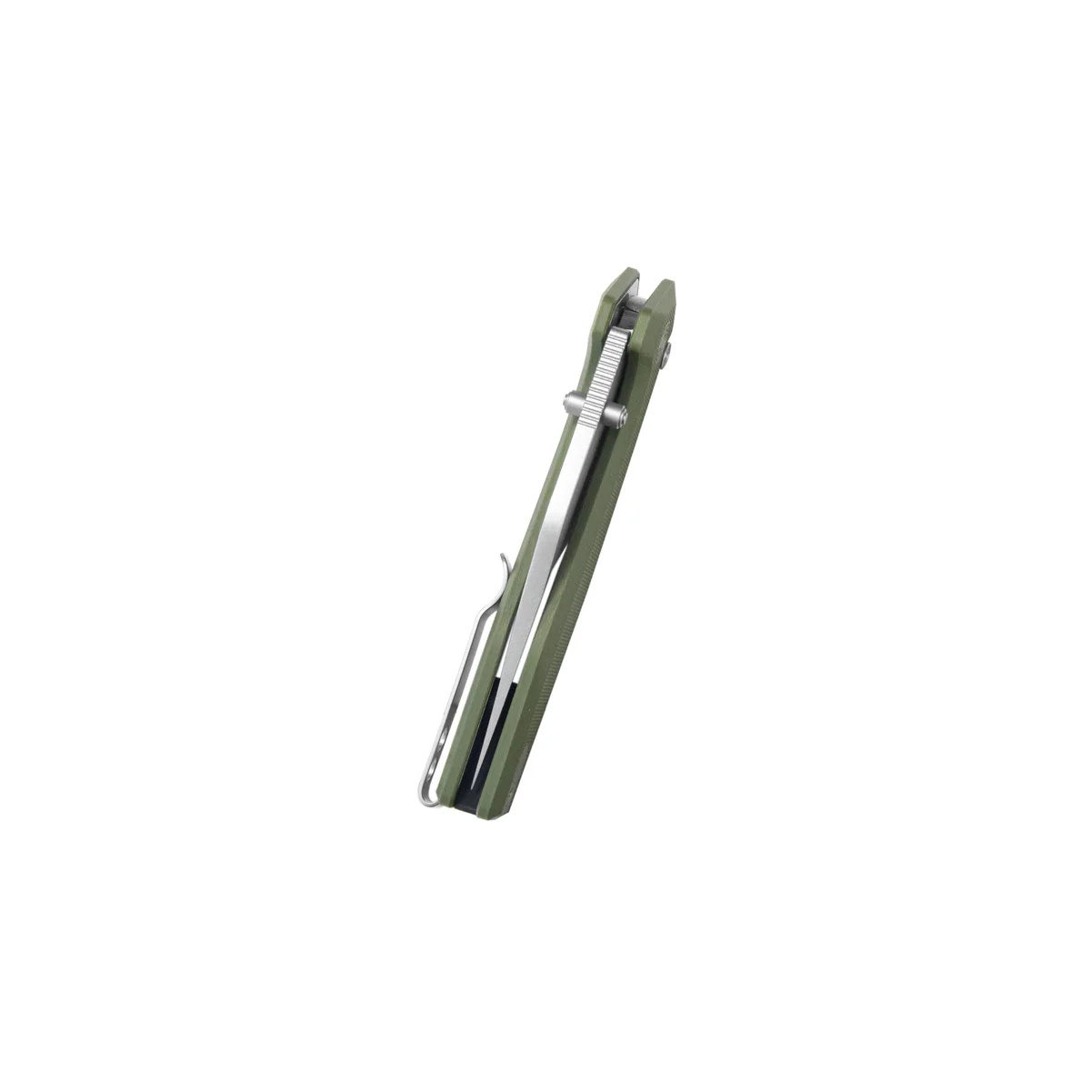 Rękojeść - okładziny z kompozytu G10, materiału niezwykle wytrzymałego mechanicznie i praktycznie całkowicie odpornego na warunki atmosferyczne i działanie chemikaliów, teksturowane dla poprawienia pewności uchwytu, przykręcono do stalowej ramy noża. Masywny backspacer zapewnia pożądaną sztywność. Prosta, solidna konstrukcja daje pewność wieloletniego użytkowania. Oś pivota zdobi stylizowane logo producenta. Dwupozycyjny (prawa/lewa) metalowy klips deep carry pozwala przenosić dyskretnie nóż w kieszeni w pozycji tip-up (czubkiem ostrza do góry). W zagłębieniu backspacera miejsce na zamocowanie linki zabezpieczającej lub ozdobnej.