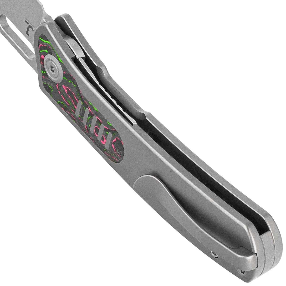 Rękojeść - z tytanu 6AL4V, materiału niezwykle wytrzymałego mechanicznie i praktycznie całkowicie odpornego na warunki atmosferyczne i działanie chemikaliów, z perfekcyjnie wpasowanymi wkładkami z kompozyty Watermelon Sugar Camocarbon. Całość skręcona do solidnego backspacera, również wykonanego z tytanu 6AL4V. Prosta, solidna konstrukcja daje pewność wieloletniego użytkowania. Jednopozycyjny (prawa) tytanowy klips deep carry pozwala przenosić dyskretnie nóż w kieszeni w pozycji tip-up (czubkiem ostrza do góry).
