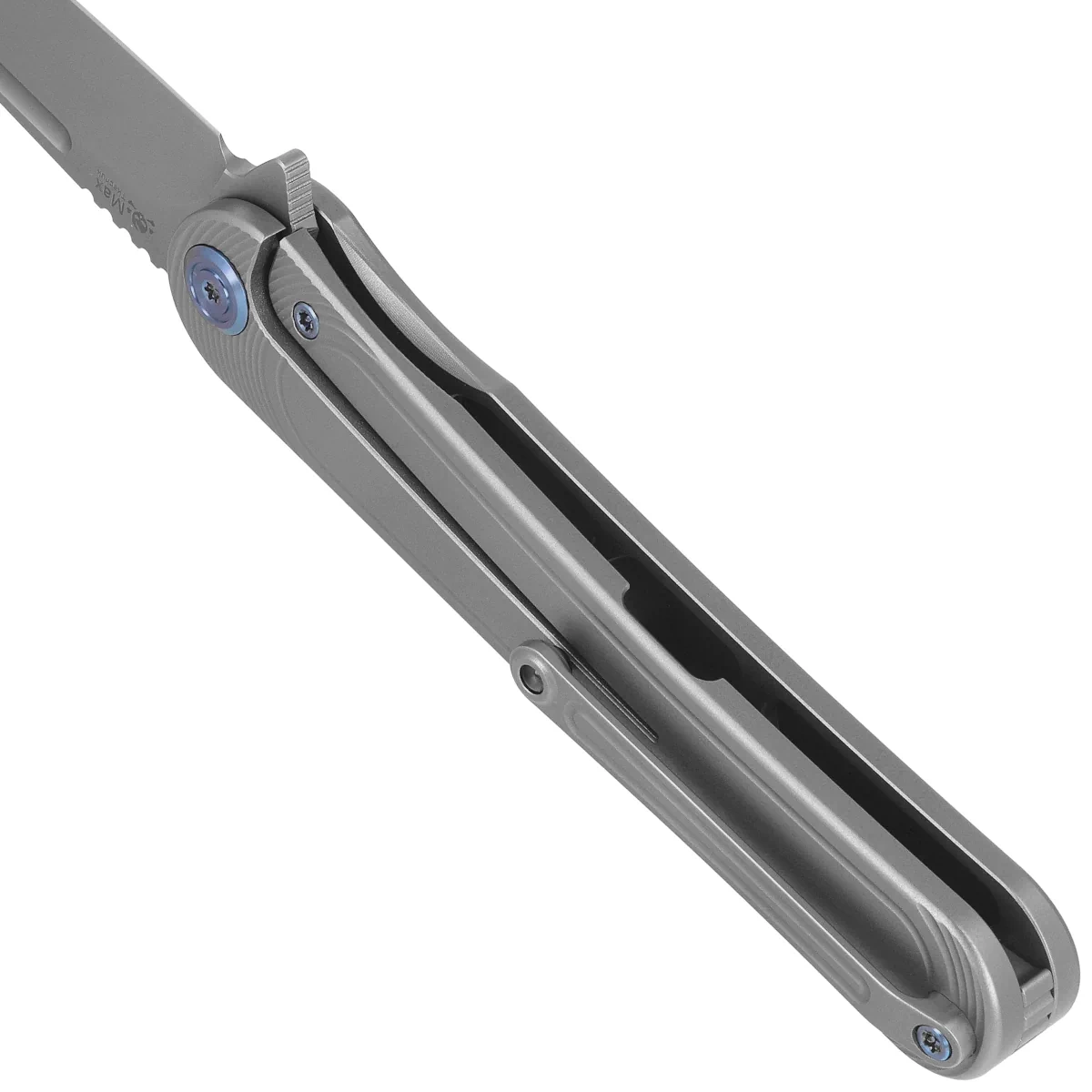 Rękojeść - profilowane okładziny z tytanu 6AL4V. Całość skręcona do solidnego backspacera, również wykonanego z tytanu. Prosta, solidna konstrukcja daje pewność wieloletniego użytkowania. Oś pivota zdobi nakładka z tytanu (Pivot Cap) w kontrastowym kolorze. Jednopozycyjny (prawa) tytanowy klips deep carry pozwala przenosić dyskretnie nóż w kieszeni w pozycji tip-up (czubkiem ostrza do góry). W tylnej części backspacera ukryte miejsce do przewleczenia linki zabezpieczającej lub ozdobnej.