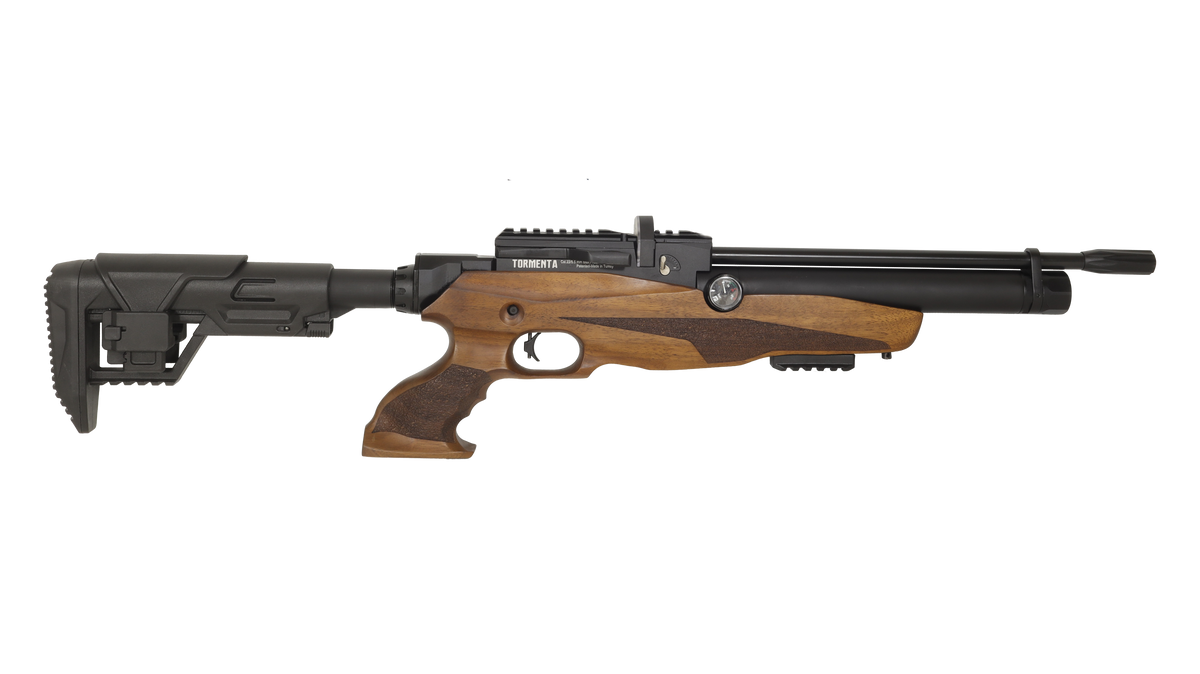 Reximex Tormenta Lite W, nowoczesna wiatrówka PCP w kompaktowej, taktycznej osadzie z chwytem pistoletowym wykonanej z orzecha tureckiego. To nowa odsłona popularnej serii wiatrówek Tormenta dostępna w jeszcze przystępniejszej cenie, z taktyczną teleskopową kolbą w systemie AR z regulowaną baką policzkową. Karabin wyposażony został w dźwignię napinania Side Lever, lekki aluminiowy kartusz, gwintowaną lufę. Dostępny w kalibrach: .177 (4.5 mm), .22 (5.5 mm), .25 (6.35 mm).