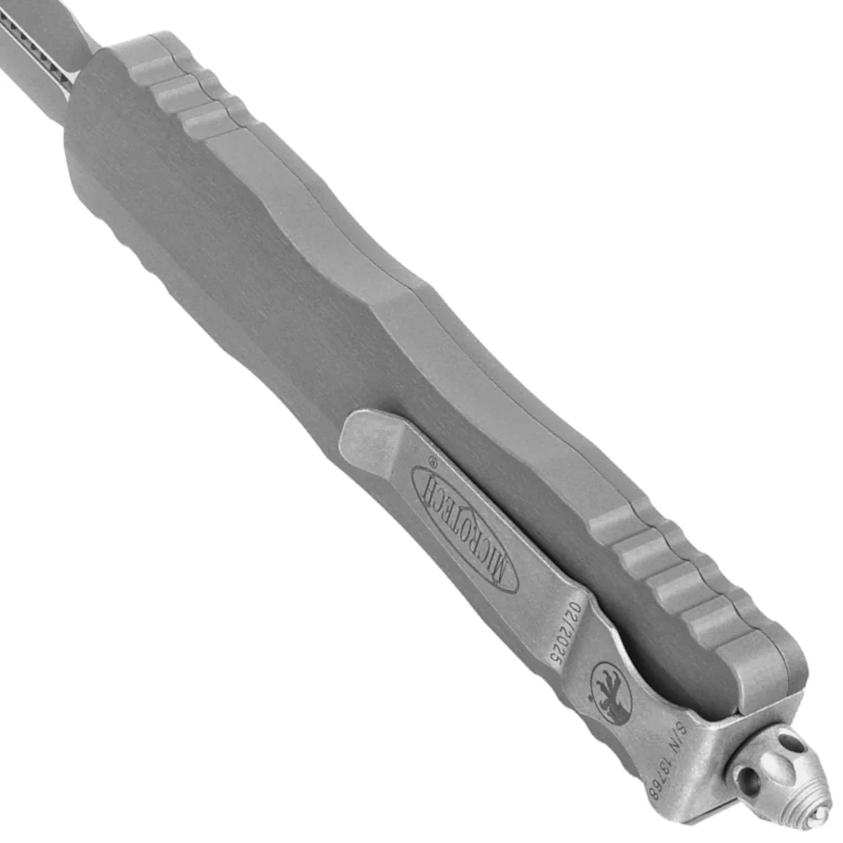 Rękojeść - wykonana z doskonałą precyzją w technologii 3D na frezarkach CNC, ze szczotkowanego i polerowanego aluminium 6061-T6. Faktura powierzchni rękojeści powoduje, że nóż nie ślizga się w dłoni podczas używania. Na grzbiecie i dole rękojeści znajdują się nacięcia (jimping) dla pewniejszego chwytu. Charakterystyczne jest umiejscowienie suwaka slidera, w zagłębieniu wyfrezowanym na boku rękojeści. Dzięki temu ręka układa się naturalniej przy otwieraniu i zamykaniu noża. Smukły profil oraz frezowany dwupozycyjny (prawa/lewa) masywny klips typu deep carry, umożliwiają dyskretne przenoszenie noża w kieszeni, w pozycji tip-down (czubkiem ostrza do dołu). Na klipsie znajduje się logo Microtech, numer seryjny i data produkcji. Rękojeść zakończono zbijakiem do bicia szyb, masywny stalowy trójkąt, w który wprasowano kulkę z węglika wolframu.