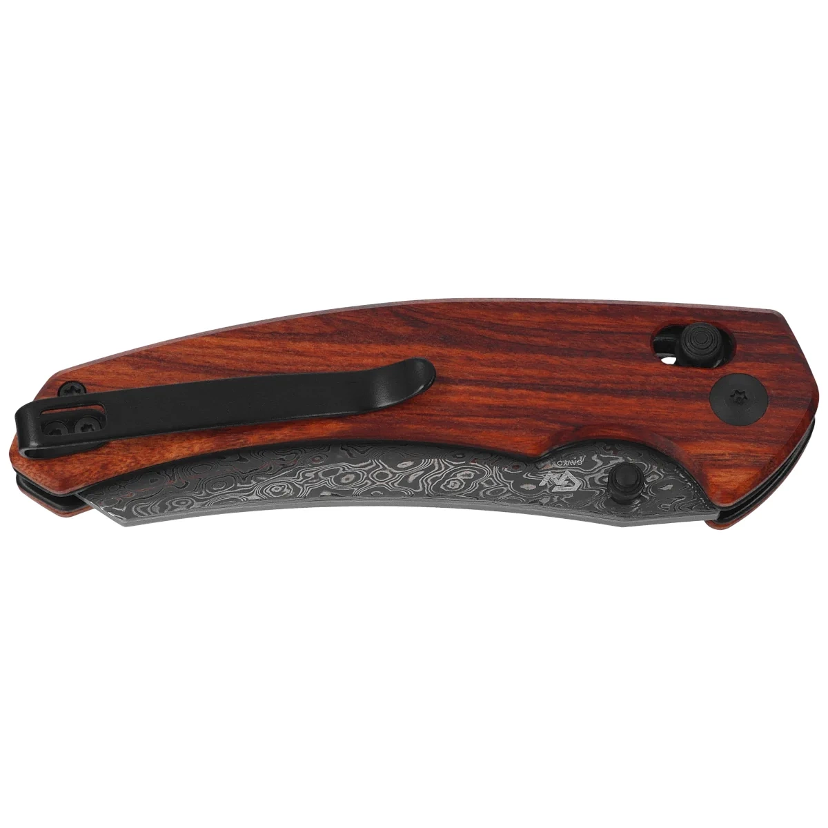 Rękojeść - wykonana z drewna egzotycznego Guibourtia. Fazowane krawędzie okładek eliminują ostre krawędzie a szorstka faktura i teksturowanie powierzchni zwiększa wygodę i pewność uchwytu. Otwarta konstrukcja tzw. open-backed mocowana stalowymi tulejami dystansowymi redukuję wagę oraz ułatwia czyszczenie. Oś pivota zdobi stylizowane logo marki Civivi. Dwupozycyjny, prawo/lewostronny klips deep carry pozwala przenosić dyskretnie nóż w kieszeni w pozycji tip-up (czubkiem ostrza ku górze).
