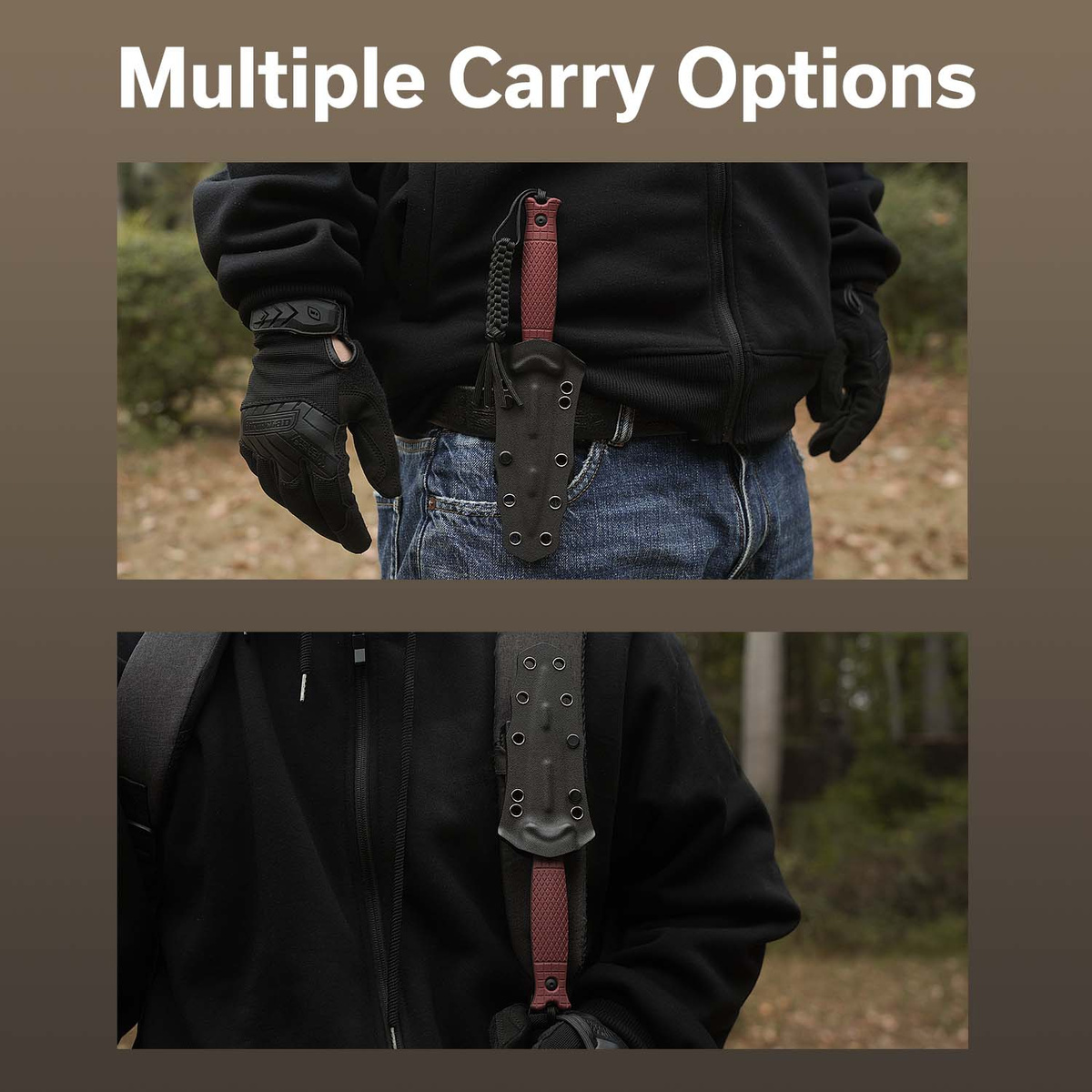 Pochwa - wykonana z czarnego kydexu bezpiecznie utrzymująca nóż na miejscu. Wyposażona w mocowanie T-Clip zaprojektowane przez Boba Terzuolę, umożliwia wielopozycyjne (prawe/lewe, pionowe/poziome) przenoszenie pochwy z stałym ostrzem na pasie lub oporządzeniu. T-Clip działający podobnie jak Tek-Lok pozwala na dopasowanie sposobu noszenia do indywidualnych preferencji użytkownika. Wzmocniony włóknem szklanym T-Clip, zawiera zestaw śrub wraz z parą plastikowych podkładek.