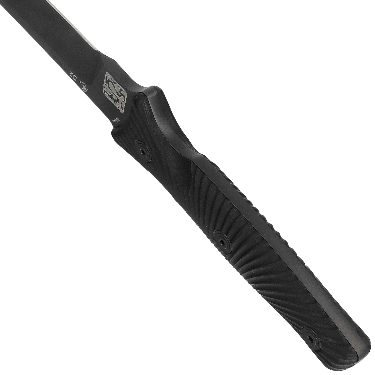 Ostrze wykonano ze stali narzędziowej D2, której właściwości zapewniają wysoką odporność na ścieranie i długie trzymanie ostrości, co czyni je idealnym narzędziem do intensywnego użytkowania w terenie. Powierzchnia klingi pokryta jest czarną powłoką proszkową, która dodatkowo zwiększa odporność na zarysowania oraz eliminuje niepożądane odbicia światła. Rękojeść wykonano z wytrzymałego kompozytu G10 o precyzyjnie teksturowanej powierzchni. Jej ergonomiczny kształt zapewnia pewny chwyt, co zwiększa bezpieczeństwo i precyzję podczas operacji. Konstrukcja gwarantuje niezawodność nawet w trudnych warunkach, oferując komfort podczas długotrwałego użytkowania. Pochwa, wykonana z trwałego tworzywa sztucznego i wyposażona w adaptery M.O.L.L.E., umożliwia bezpieczne mocowanie noża do różnorodnego wyposażenia taktycznego. Wielopozycyjny system mocowania pozwala na dostosowanie noża do indywidualnych potrzeb użytkownika. To narzędzie zaprojektowano z myślą o precyzyjnych operacjach, w których każdy detal podporządkowany jest praktyczności i niezawodności.