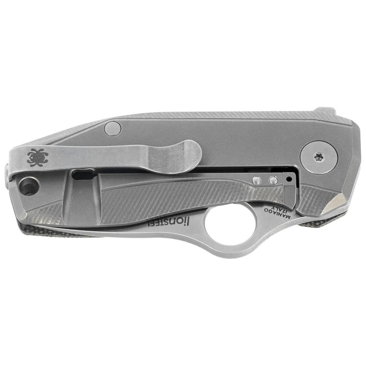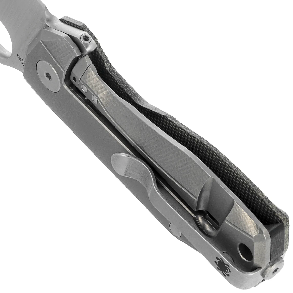 Rękojeść - harmonijne połączenie kompozytu Canvas Micarta i tytanu, które oferuje nie tylko kontrast wizualny, ale i realną wartość użytkową. Okładzina z zielonej Micarty wnosi lekkość, teksturę i naturalny wygląd, natomiast tytanowa strona – zintegrowana z blokadą R.I.L. – odpowiada za sztywność i bezpieczeństwo mechaniczne. Projekt rękojeści wspiera wygodne operowanie nożem w codziennych zadaniach, pomimo jego niewielkich wymiarów. Delikatnie zaokrąglone krawędzie, ergonomiczny kształt oraz otwarta konstrukcja ułatwiają zarówno chwyt, jak i czyszczenie. Wire clip w pozycji tip-up, przeznaczony dla prawo ręcznych użytkowników, zapewnia dyskretne i pewne mocowanie. To miniaturowe narzędzie o pełnowymiarowej precyzji, stworzone z myślą o najbardziej wymagających kolekcjonerach i użytkownikach EDC.