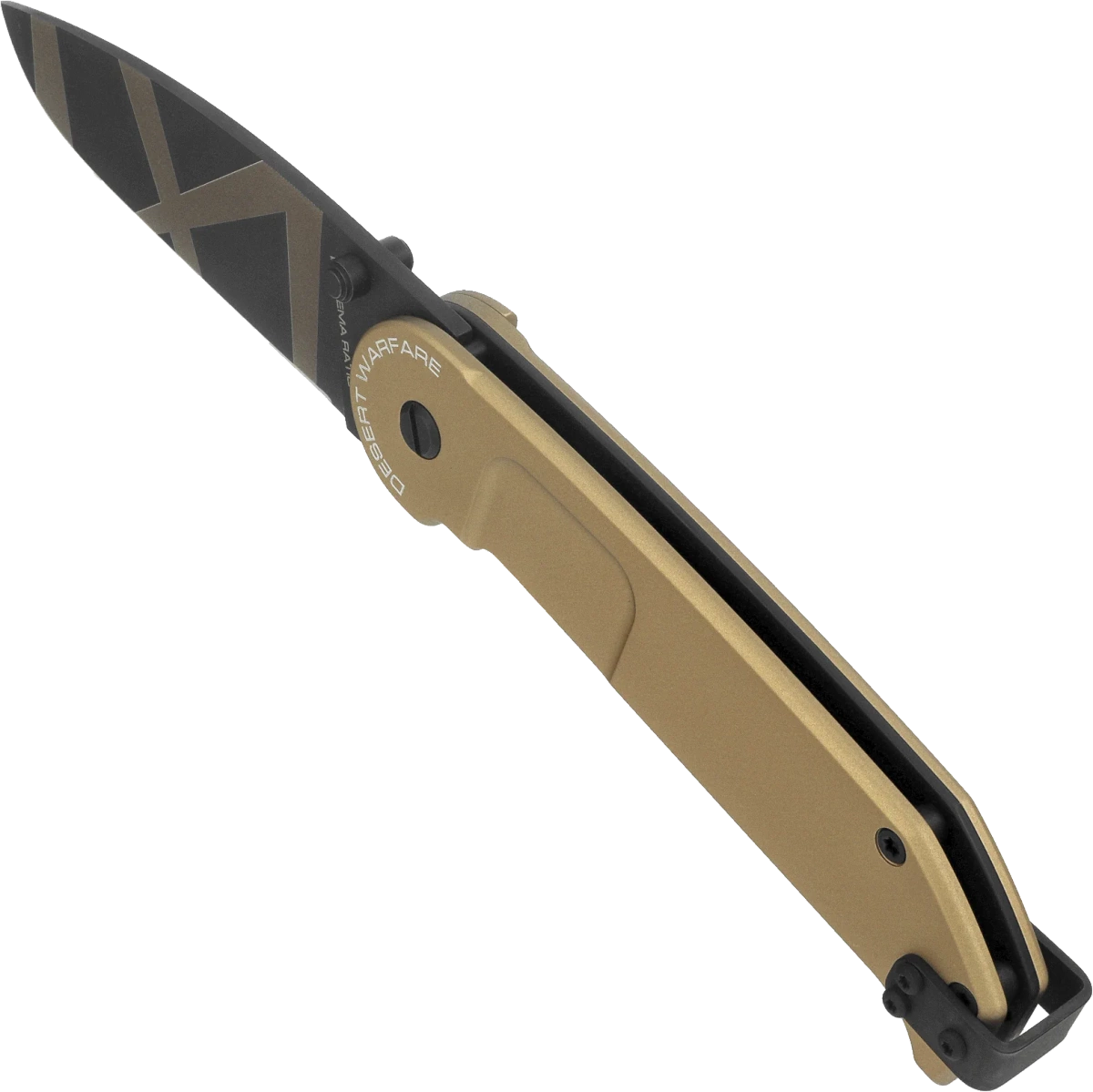 Głownia - niezwykle ostra Drop Point z wyraźnie zaznaczonym brzuchem ostrza. Klingę pokryto matową nierefleksyjną powłoką, grawerowaną laserowo pustynnym kamuflażem Desert Warfare. Ostrze gładkie Plain wyprowadzono szlifem płaskim (Flat grind) który zapewnia wytrzymałość, doskonałą geometrię krawędzi tnącej oraz ekstremalną wydajność cięć. Otwierany przy pomocy obustronnego kołka w klindze (dual thumb studs). Dwustopniowa blokada ostrza: solidny mechanizm Liner-Lock, połączono z dodatkową ręczną blokadą.