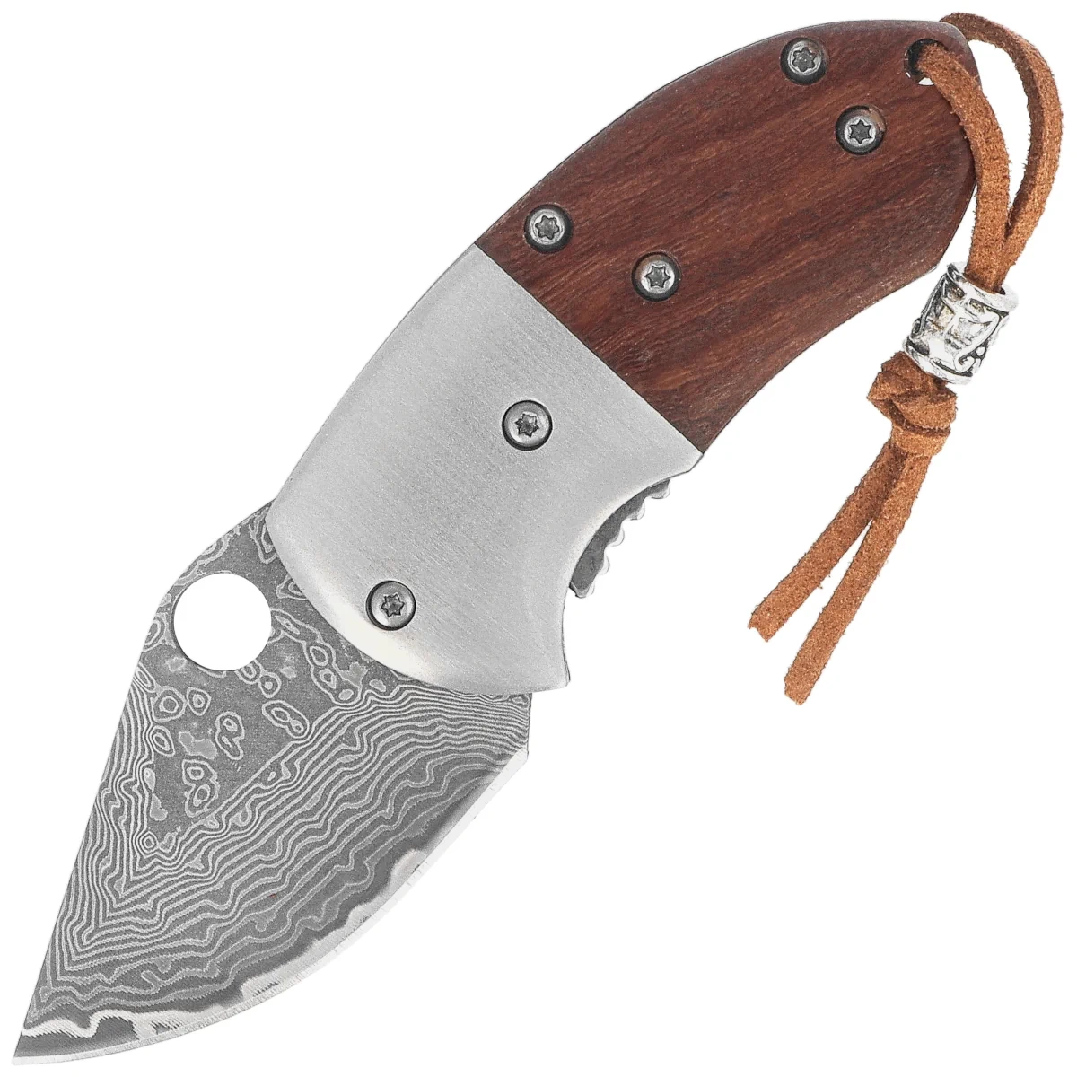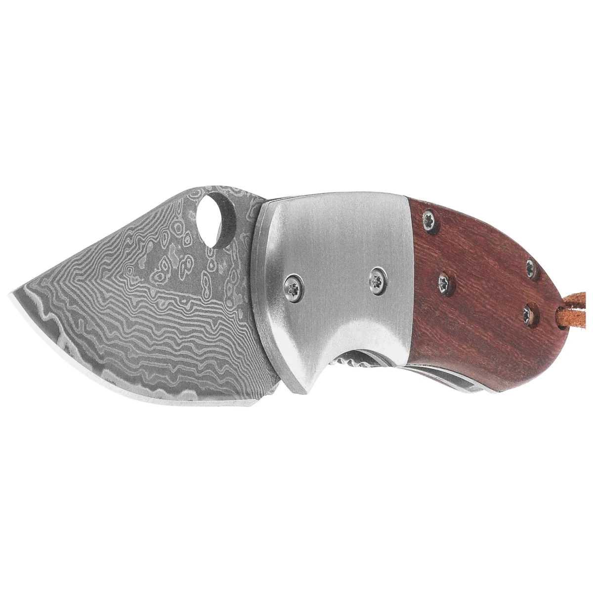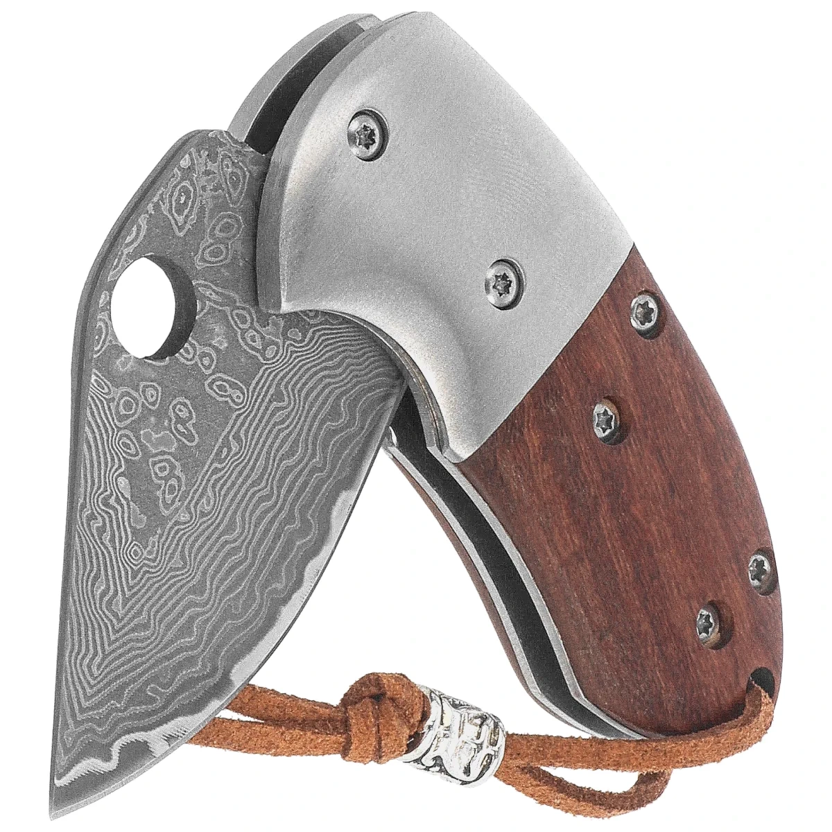 Rękojeść - z naturalnego drewna, którego subtelna faktura i barwa wprowadzają element rzemieślniczego stylu. Gładkie, zaokrąglone krawędzie zapewniają wygodny chwyt, a precyzyjne spasowanie z korpusem stalowym gwarantuje stabilność konstrukcji. Brak klipsa sprzyja minimalistycznej estetyce, a skórzany rzemyk z metalowym pierścieniem umożliwia szybkie mocowanie do plecaka lub zestawu EDC. Kompaktowe wymiary i staranna obróbka sprawiają, że rękojeść idealnie dopełnia głownię z damastu – tworząc nóż składany, który łączy w sobie funkcjonalność, trwałość i klasyczną elegancję.