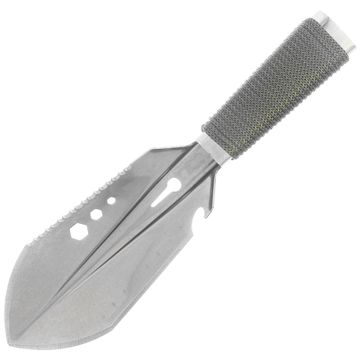 33543 Green Strung, Satin to lekkie i poręczne narzędzie outdoorowe zaprojektowane z myślą o użytkownikach, którzy potrzebują kompaktowego sprzętu do zadań terenowych, survivalowych oraz ogrodowych. Głownia wykonana z nierdzewnej stali zapewnia odporność na wilgoć i uszkodzenia mechaniczne, a matowe wykończenie satin nadaje narzędziu techniczny charakter i ogranicza refleksy świetlne. Profil funkcjonalny, zawierający krawędź tnącą, sztych i ząbkowaną sekcję, umożliwia kopanie, przecinanie korzeni, rozdrabnianie podpałki i inne prace obozowe. Do tego mamy linijkę, sześciokątne otwory do odkręcania śrub, narzędzie do wyciągania gwoździ i otwieracz do butelek. Rękojeść opleciono zielonym sznurkiem nylonowym, który poprawia chwyt, a w sytuacjach awaryjnych może pełnić funkcję linki pomocniczej. Do zestawu dołączono pochwę z nylonu w kamuflażu, którą można wygodnie przypiąć do pasa lub ekwipunku. Model 33543 to narzędzie dla osób ceniących funkcjonalność, kompaktowy format i gotowość do działania w każdych warunkach terenowych.