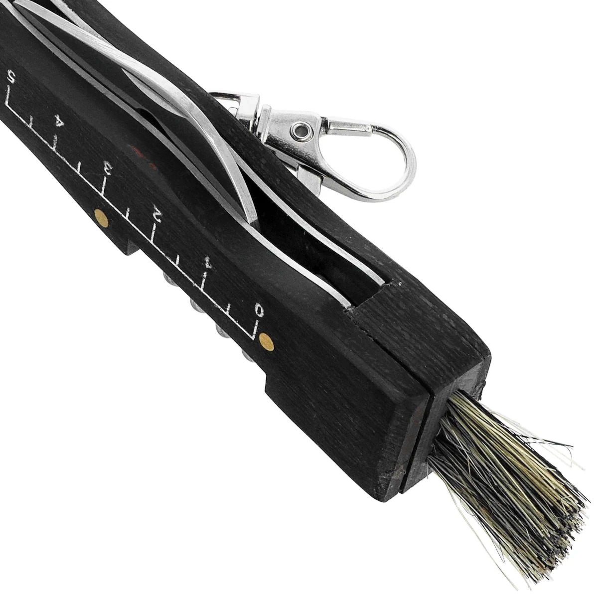 Rękojeść - z drewna naturalnego wyróżnia się nadrukiem linijki, która pomaga w ocenie wielkości zbieranych grzybów. W tylnej części umieszczono szczoteczkę z naturalnego włosia, pozwalającą na wstępne oczyszczanie grzybów bez potrzeby noszenia osobnych akcesoriów. Wbudowana metalowa pęseta umożliwia dokładne usuwanie igliwia i mchów. Na grzbiecie wygodny korkociag. Kółko na klucze z krótkim łańcuszkiem ułatwia mocowanie do plecaka lub spodni, a dołączony pokrowiec wspiera wygodne przenoszenie w terenie. Ergonomiczny kształt oraz dobrze wyważony balans rękojeści gwarantują komfort użytkowania nawet przez dłuższy czas. To konstrukcja zaprojektowana z myślą o sprawnym grzybobraniu – lekka, poręczna i odporna na warunki terenowe.