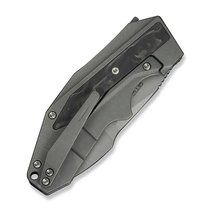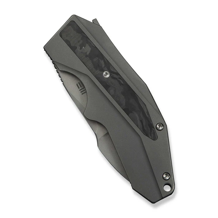 Rękojeść - wykonano z frezowanego tytanu 6Al-4V, zapewniającego wysoką sztywność, odporność mechaniczną i lekkość. Główne panele wzbogacono o wkładki z unikalnego kompozytu Marble Carbon Fiber, oferującego trójwymiarowy efekt optyczny i podwyższoną przyczepność powierzchni w każdych warunkach. Delikatne profilowanie krawędzi oraz ergonomiczne podcięcia pod palce wspierają komfort i kontrolę pracy nawet przy dłuższym użytkowaniu w środowisku terenowym lub EDC. Konstrukcję wzmacnia precyzyjnie spasowany backspacer oraz klips typu deep-carry tip-up, umożliwiający dyskretne i stabilne przenoszenie noża w kieszeni. Całość utrzymana została w eleganckiej, minimalistycznej estetyce, łączącej nowoczesną inżynierię z najwyższą kulturą wykonania typową dla projektów Cecchiniego w linii premium WeKnife.