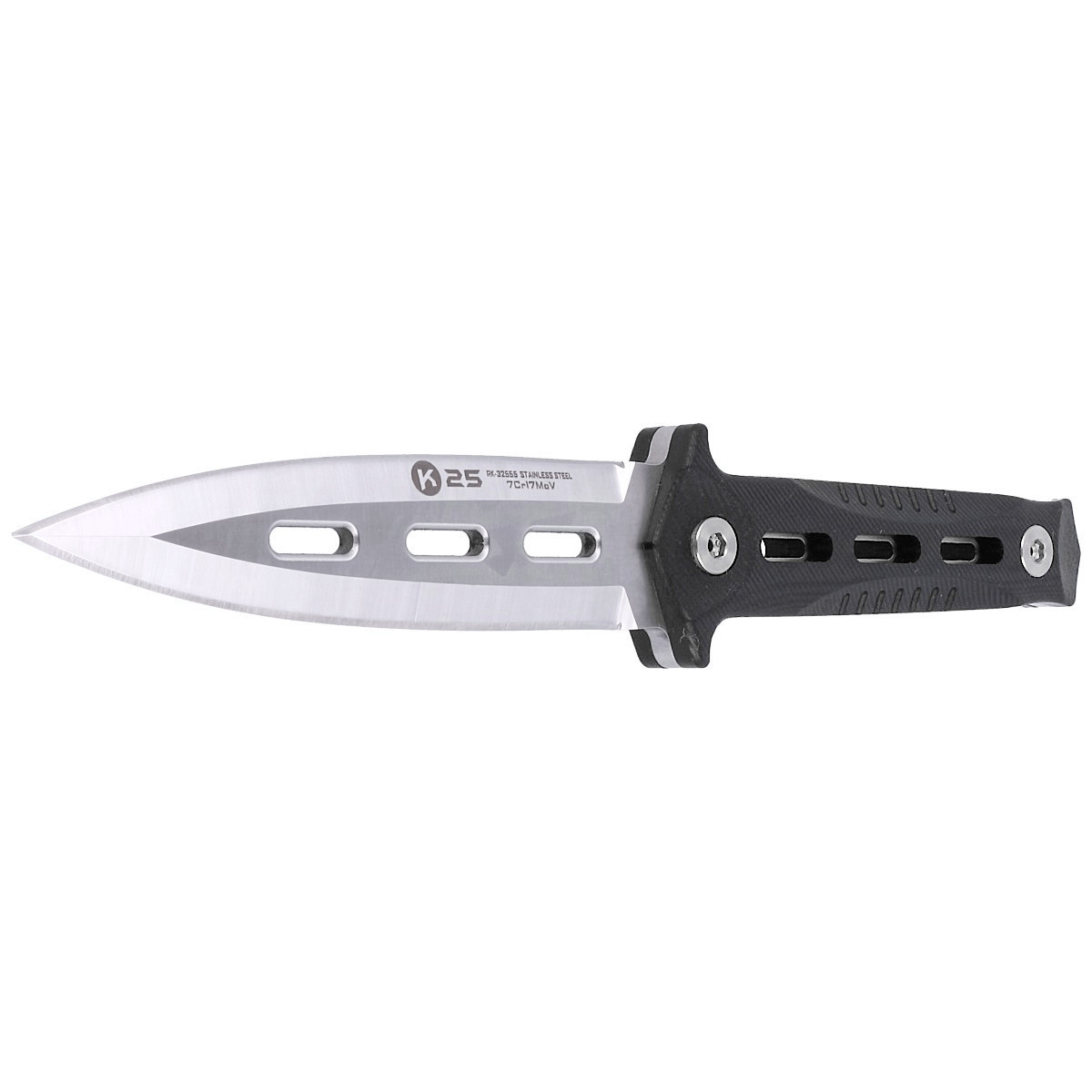- Boot Knife Black G10, Satin – pełnowymiarowy nóż taktyczny typu dagger od K25 z głownią ze stali 7Cr17MoV wykończoną satynowaniem i rękojeścią z wytrzymałego kompozytu G10. Wyposażony w pochwę z systemem Quick Release.