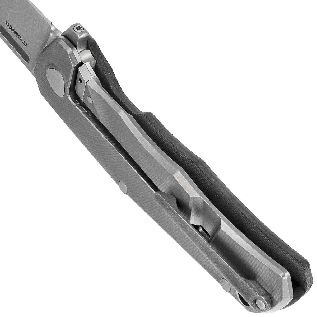 Rękojeść - strona prezentacyjna z kompozytu G10, strona blokady z frezowanego tytanu 6Al-4V, znanego z lekkości i wyjątkowej odporności mechanicznej. Wyprofilowany uchwyt z zaokrąglonymi krawędziami pozwala na wygodny i pewny chwyt, nawet przy długotrwałym użytkowaniu. Zintegrowany mechanizm frame lock zwiększa bezpieczeństwo pracy, a obustronnie montowany klips deep carry z tytanu umożliwia niskoprofilowe przenoszenie noża – niezależnie od dominującej ręki użytkownika. Ergonomia, estetyka i funkcjonalność łączą się w tym modelu w sposób kompleksowy, oferując doskonałe narzędzie EDC nowej generacji.