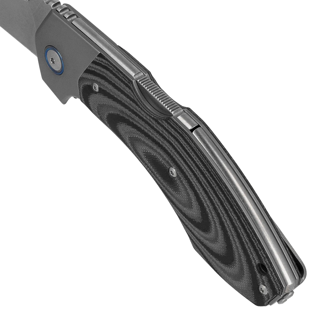 Głownia - typu Drop Point o wyraźnie zaznaczonym brzuchu, wykończona maskującą drobne rysy powstałe podczas użytkowania metodą Stonewashed. Solidna grubość klingi w połączeniu z wysokim, płaskim szlifem (Flat Grind) daje doskonałą geometrię krawędzi tnącej oraz ekstremalną wydajność cięcia przy zachowaniu dużej wytrzymałości. System łożysk kulkowych wspomaga płynne otwarcie ostrza, które można otworzyć za pomocą obustronnych kołków thumb stud. Mechanizm blokady Back Lock. Na grzbiecie głowni karbowane oparcie pod kciuk upper jumping.