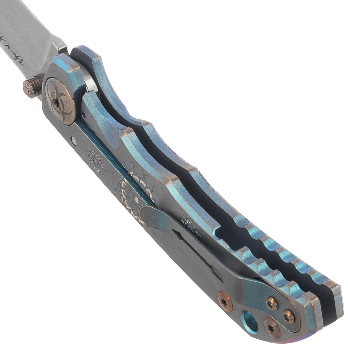 Solidna rękojeść z tytanu ozdobiona jest artystycznym grawerunkiem, przedstawiającym motyw Doktora Zarazy. Całość uzupełniają anodowane na brąz detale, które efektownie kontrastują z zielonym odcieniem rękojeści. Dzięki odpowiednio wyprofilowanemu uchwytowi nóż pewnie leży w dłoni, zapewniając precyzję podczas wykonywania różnorodnych działań. Solidny mechanizm blokujący typu frame lock gwarantuje bezpieczne użytkowanie nawet w ekstremalnych warunkach. Każdy egzemplarz jest wykonywany ręcznie w USA, co czyni go wartościowym i poszukiwanym przedmiotem zarówno wśród kolekcjonerów, jak i wymagających użytkowników.