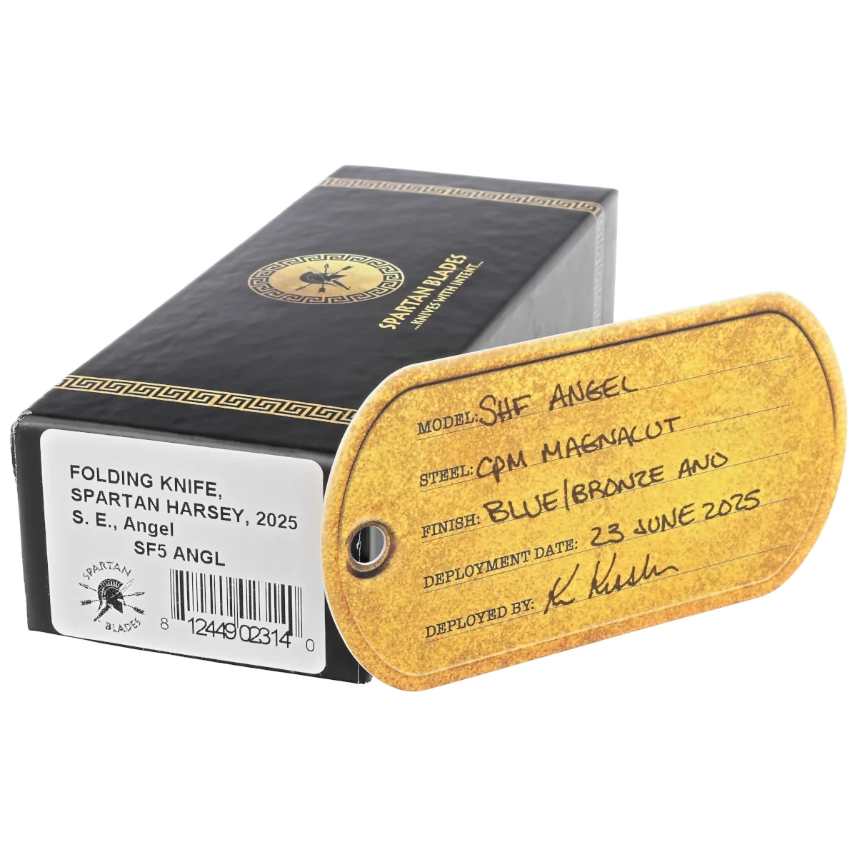 • Spartan Harsey Folder S.E. Angel Blue Titanium, Bronze HW, Satin, limitowana edycja dużego foldera taktycznego projektu legendy knifemakingu, Billa Harseya. Ergonomiczna tytanowa rękojeść ozdobiona grawerunkiem, głownia ze stali MagnaCut.