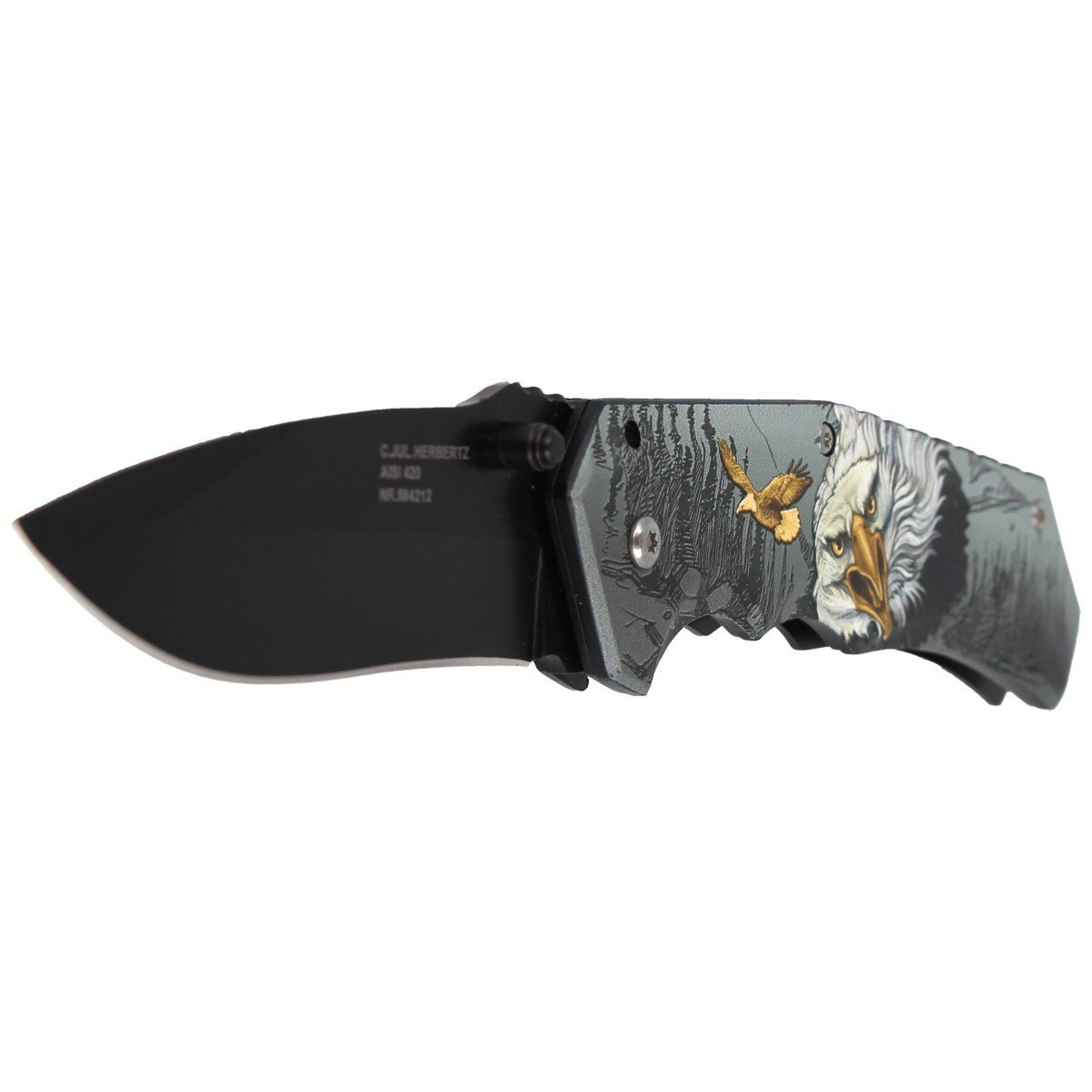 - Herbertz CJH 3D Eagle, Black – składany nóż użytkowy z głownią typu drop point ze stali nierdzewnej 420, pokrytej czarną powłoką oraz metalową rękojeścią z dekoracyjną grafiką orła. Estetyka 3D i funkcjonalność w solidnej konstrukcji EDC.