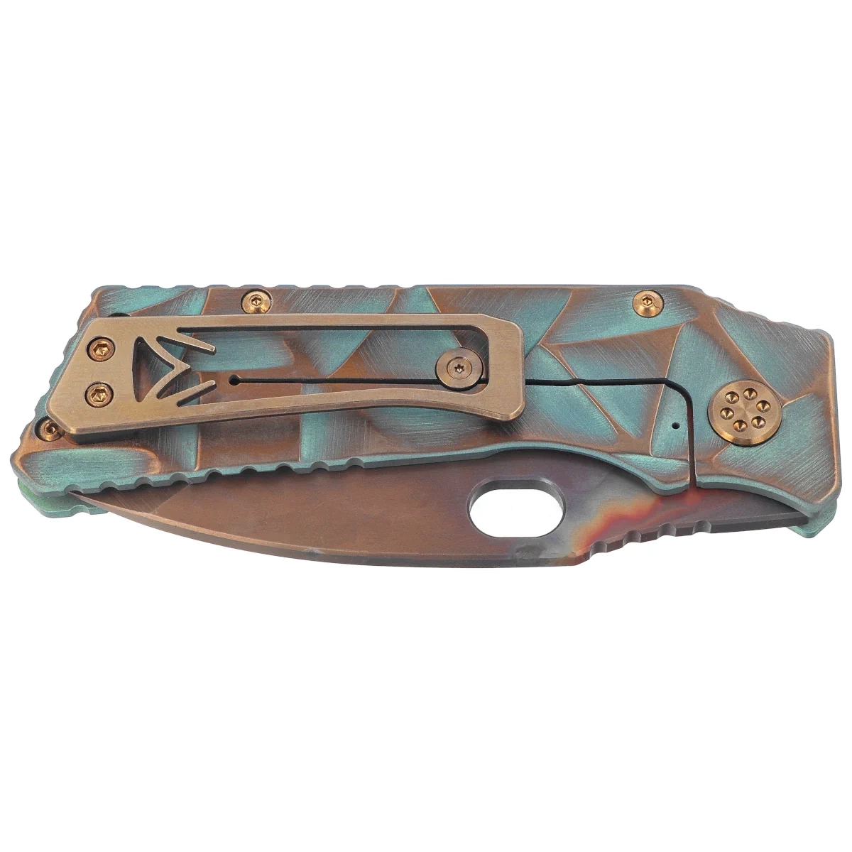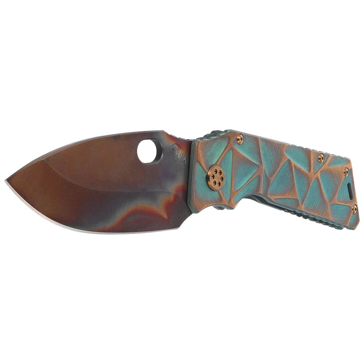 - TFF-1 Green Brsh/Bronze "Stained Glass", Bronze HW, Brsh/Bronze Clip, Vulcan, ekskluzywny nóż składany klasy premium, zaprojektowany przez Grega Medforda. Wykończenie Vulcan, tytanowa rękojeść typu Stained Glass i stal CPM S45VN.