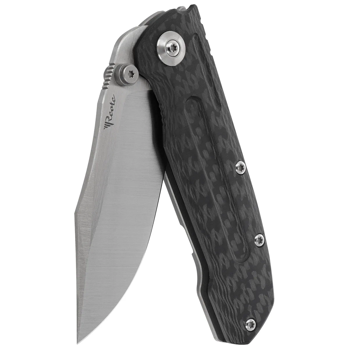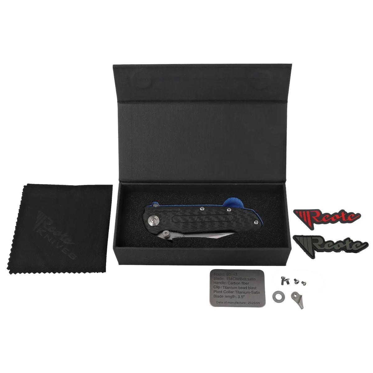 Rękojeść - strona prezentacyjna z kompozytu Carbon Fiber, strona blokady z tytanu, wykończona metodą Dark Bead Blasted, gwarantuje sztywność, lekkość i wysoką odporność na zużycie. Frezowane podcięcia pod palce i fazowane krawędzie poprawiają ergonomię, a backspacer z tytanu wzmacnia strukturę oraz pozwala na zamocowanie linki. Klips deep carry umożliwia dyskretne przenoszenie, a blokada frame lock ze stalową wkładką dba o bezpieczeństwo użytkowania. Akcenty w postaci anodowanych na niebiesko śrub i pivotu podkreślają futurystyczny charakter projektu i wyróżniają ten model na tle innych noży taktycznych.