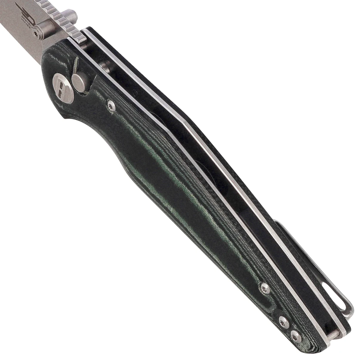 Rękojeść - okładziny z kompozytu Micarta zostały zamontowane na stalowych linersach, zapewniając wytrzymałość przy zachowaniu lekkości całej konstrukcji. Ergonomiczny kształt wspiera naturalny układ palców, a wyraźna faktura materiału pozwala zachować pewność chwytu nawet w trudnych warunkach. Na grzbiecie znalazło się frezowanie (jimping) zwiększające kontrolę podczas pracy. Całość uzupełnia dwustronny (prawa/lewa) stalowy klips deep carry.