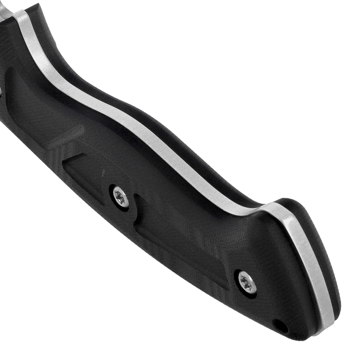 - Venatus S Black G10, Satin Nitrogen – profesjonalny nóż myśliwski o konstrukcji full tang, z głownią typu drop point ze stali Nitrogen i ergonomiczną rękojeścią z kompozytu G10. Projektowany do intensywnego użytkowania terenowego w wymagających warunkach