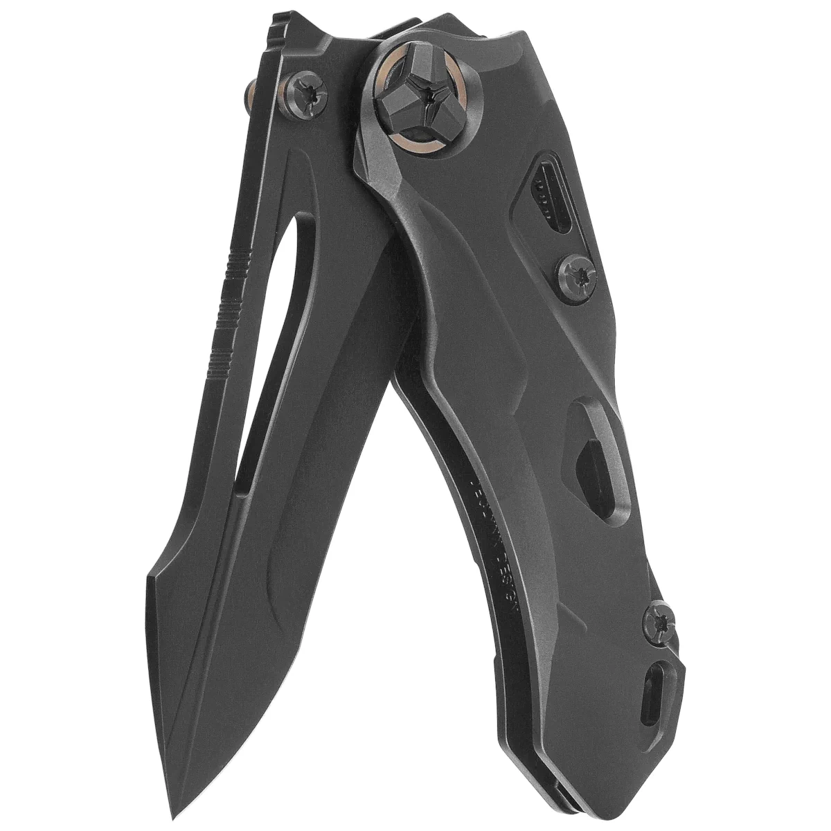 Głownia - typu harpoon, pokryta czarną powłoką DLC. Długa krawędź tnąca, zbiega się w kierunku ostrego jak igła czubka szerokiej klingi. Grubość ostrza i zbrocze zapewniają wysoką wytrzymałość. Zastosowano tu szlif mieszany, w tylnej części jest to wklęsły szlif do cięcia i prac precyzyjnych tzw Hollow Ground Primary Bevel. W przedniej części mamy wysoki, płaski szlif wzmacniający czubek Flat Ground. Nóż możemy otworzyć przy użyciu płetwy front flippera lub podłużnego otworu w klindze (Thumb Hole). Całość blokowana jest nowoczesną blokadą Frame Lock ze stalową wkładką zapobiegającą wycieraniu się czoła blokady.