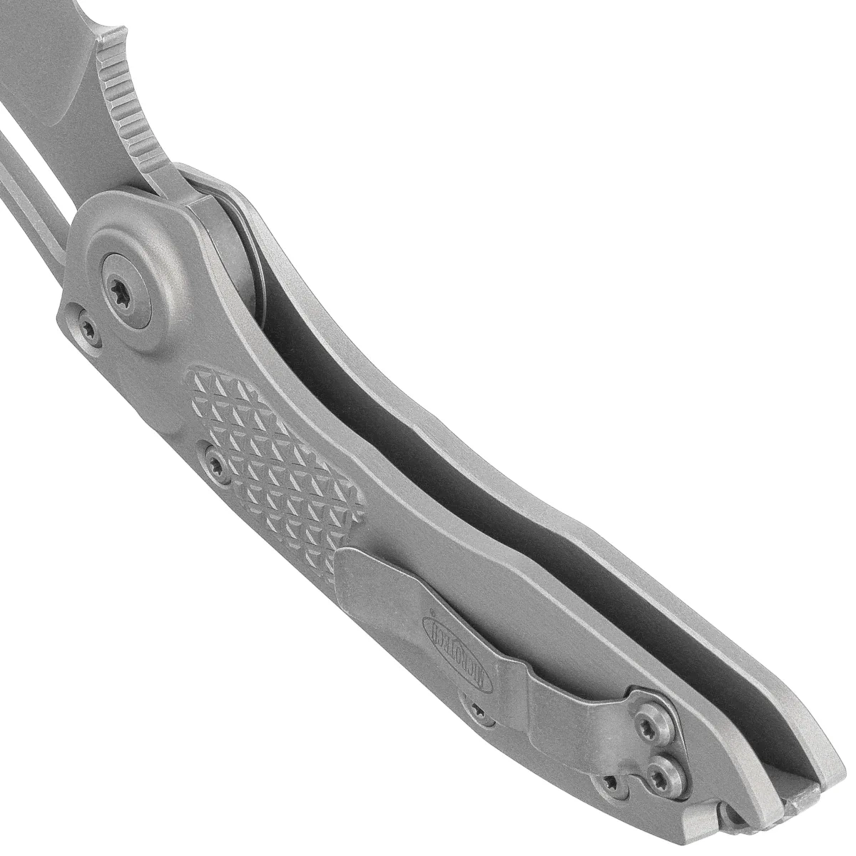 Rękojeść - wykonana na frezarkach CNC z doskonałą precyzją, z 6061-T6 Aluminium o głęboko frezowanej strukturze Tri-Grip. Szeroki przycisk otwierający nóż został umieszczony w zagłębieniu, co chroni przed przypadkowym otwarciem. Obie okładziny zostały skręcone przy pomocy solidnego, aluminiowego backspacera. Dwustronny (prawa / lewa) klips pozwala dyskretnie nosić nóż w pozycji tip-up. Wystający fragment backspacera w którym znajduje się otwór na linkę, może również służyć za improwizowany zbijak do szkła.