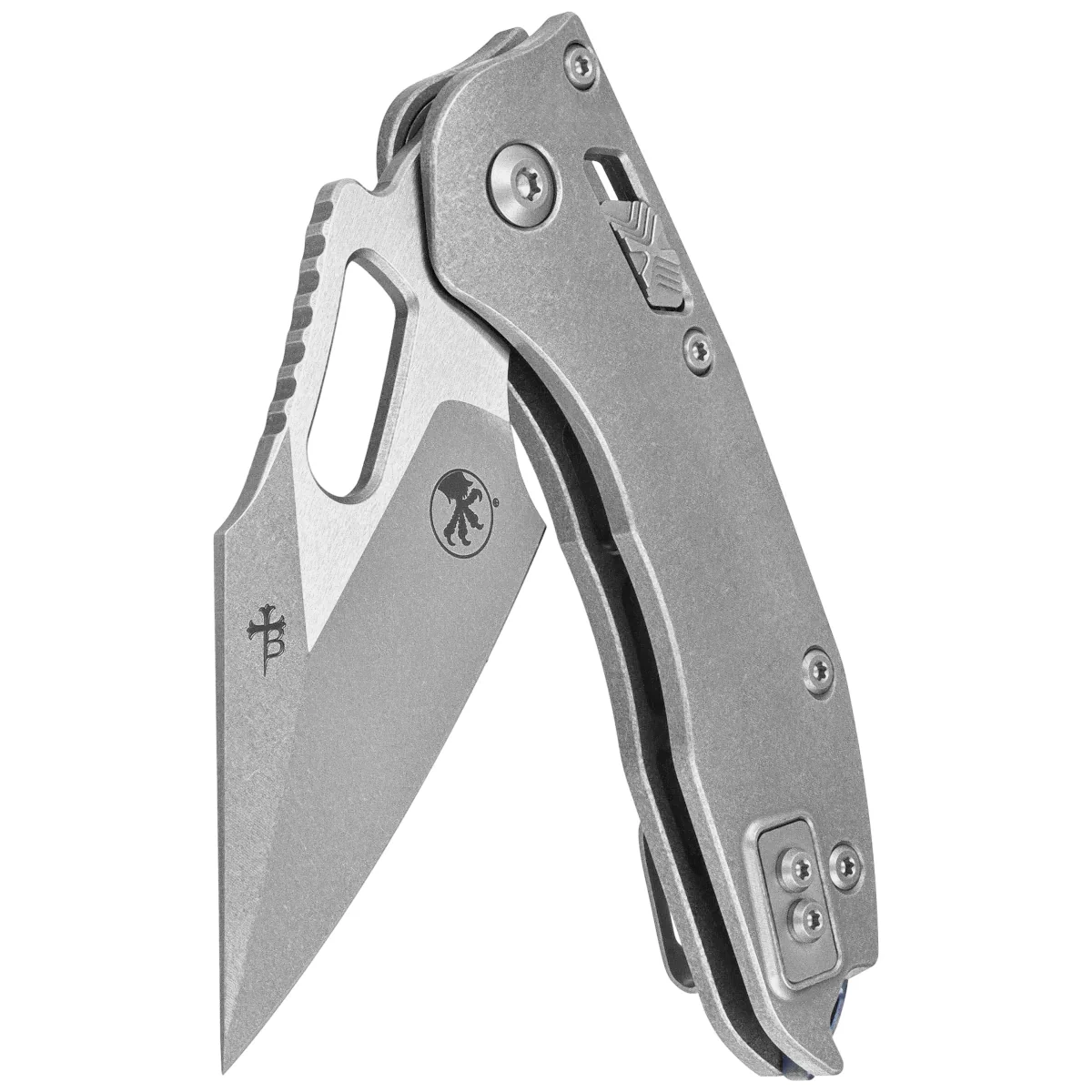 Rękojeść – wykonana z najwyższą precyzją w technologii 3D na frezarkach CNC z wytrzymałego tytanu, wykończonego metodą stonewashed, co nadaje jej elegancki, matowy wygląd i odporność na drobne zadrapania. Okładziny w wersji Slab Side mają gładką, pozbawioną dodatkowego profilowania i tekstury powierzchni, dzięki czemu całość zyskuje minimalistyczny, czysty charakter. Szeroki suwak blokady z charakterystyczną dla firmy Microtech schodkową strukturą (X Button) zapewnia pewną i komfortową obsługę. Obie okładziny połączono solidnym, tytanowym niebieskim backspacerem, który zwiększa sztywność konstrukcji. Dwustronny (prawa/lewa) klips umożliwia dyskretne noszenie noża w pozycji tip-up. Wystający fragment backspacera z otworem na linkę może również służyć jako improwizowany zbijak do szyb. Hardware (śruby, pivot, suwak) wykończone metodą Double Vapor Blast.
