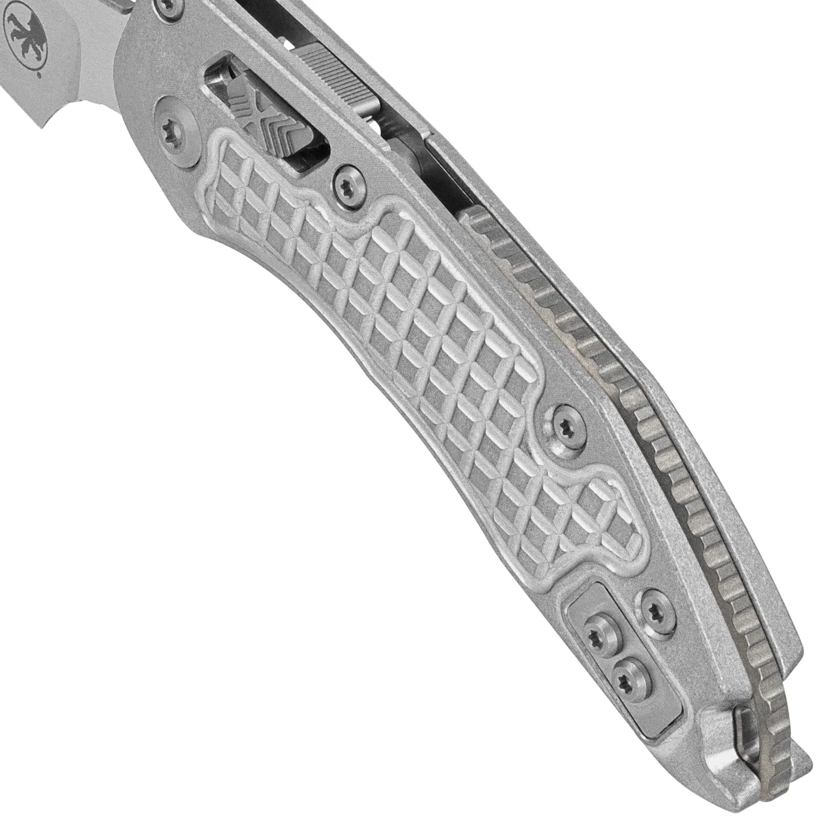 Rękojeść – wykonana z najwyższą precyzją w technologii 3D na frezarkach CNC z wytrzymałego tytanu, wykończonego metodą stonewashed, co nadaje jej elegancki, matowy wygląd i odporność na drobne zadrapania. Dla lepszego chwytu powierzchnia rękojeści została pokryta charakterystyczną fakturą imitującą powierzchnię granatu odłamkowego (Frag Pattern). Szeroki suwak blokady z charakterystyczną dla firmy Microtech schodkową strukturą (X Button) zapewnia pewną i komfortową obsługę. Obie okładziny połączono solidnym, tytanowym backspacerem barwionym na brąz, który zwiększa sztywność konstrukcji. Dwustronny (prawa/lewa) klips umożliwia dyskretne noszenie noża w pozycji tip-up. Wystający fragment backspacera z otworem na linkę może również służyć jako improwizowany zbijak do szyb. Hardware (śruby, pivot, suwak) wykończone metodą Double Vapor Blast.