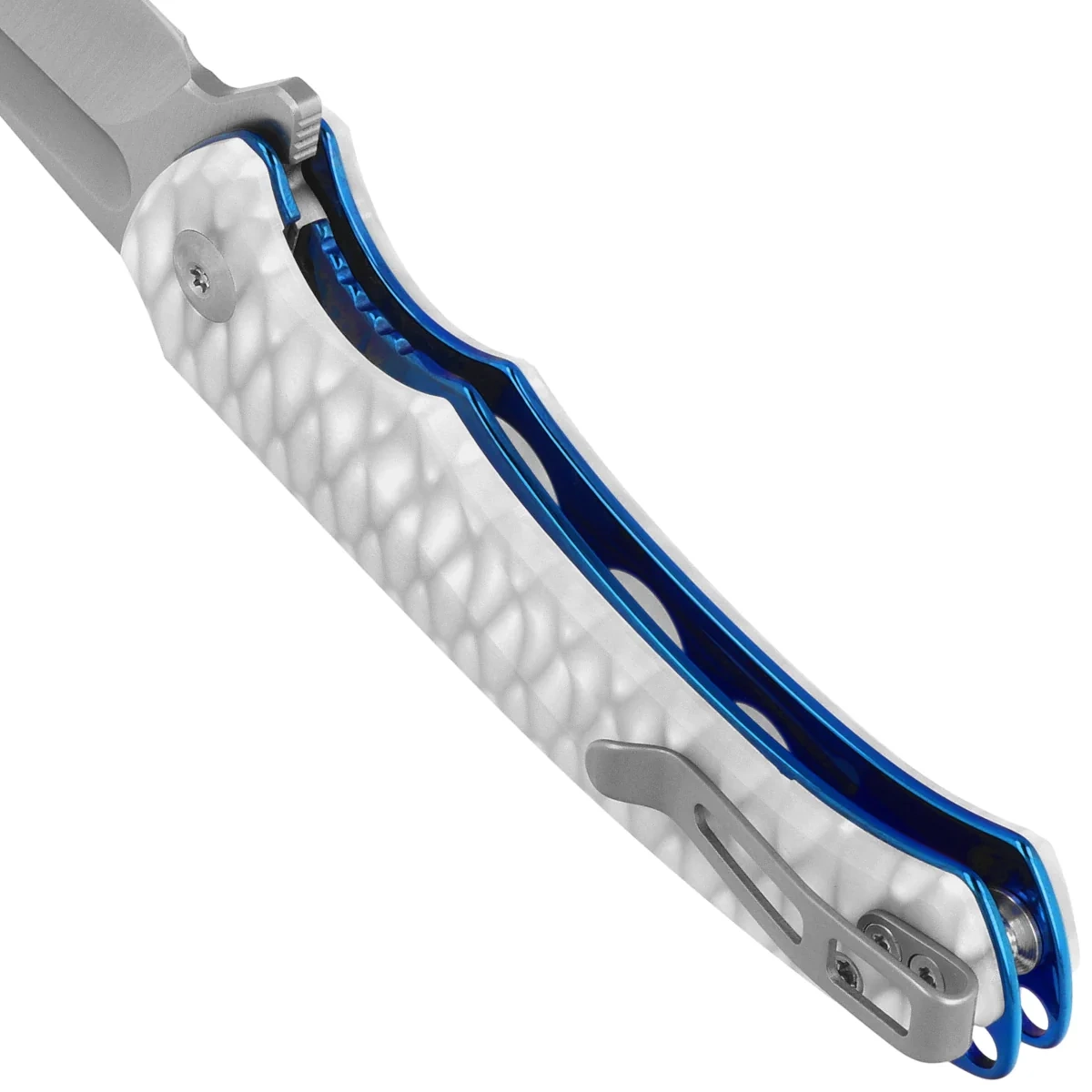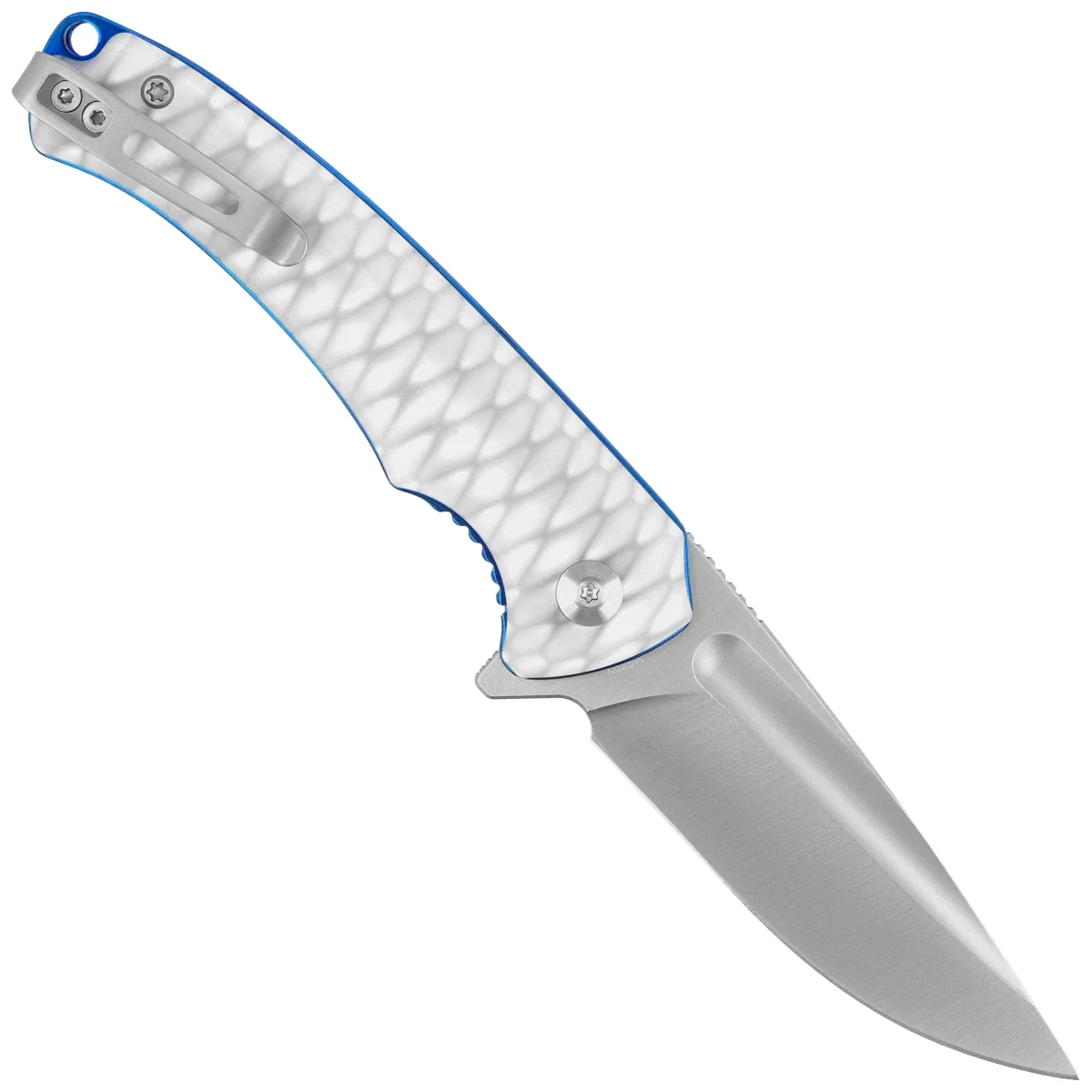 Głownia - typu drop point została wykonana z wytrzymałej stali nierdzewnej 14C28N, oferującej dobrą retencję ostrości, odporność na rdzę oraz łatwość ostrzenia. Szlif wklęsły zapewnia precyzyjne prowadzenie ostrza, a satynowana powierzchnia nadaje mu eleganckiego wyglądu. Otwieranie odbywa się za pomocą flippera, który w połączeniu z łożyskami ceramicznymi gwarantuje aksamitnie płynny ruch ostrza – bez oporu, bez hałasu, z natychmiastową gotowością do działania.
