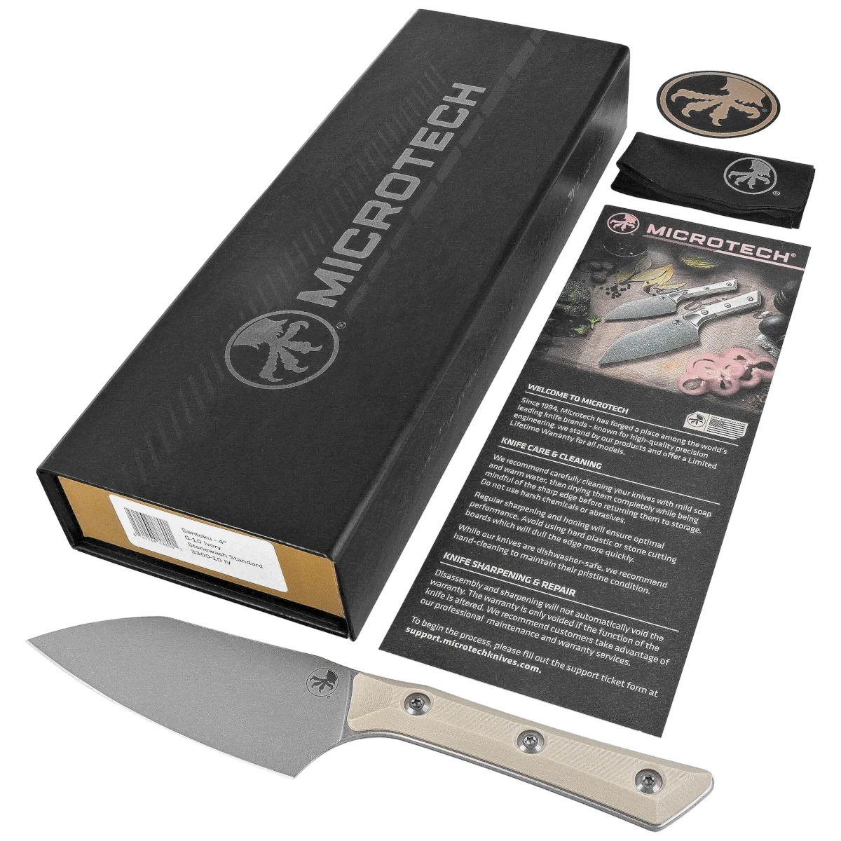 Rękojeść - z kompozytu G10 to połączenie wytrzymałości, lekkości i ergonomii, dopasowanej do potrzeb intensywnej pracy w kuchni. Jej prosty, funkcjonalny kształt oraz subtelna tekstura powierzchni zapewniają pewny chwyt w każdej sytuacji – także przy wilgotnych dłoniach lub w warunkach wysokiej wilgotności. Mocowanie na trzech śrubach torx zwiększa sztywność konstrukcji i ułatwia dostęp do wnętrza w przypadku konieczności czyszczenia. Wyprofilowany grzbiet rękojeści pozwala na naturalne prowadzenie dłoni, minimalizując zmęczenie i zwiększając kontrolę nad ostrzem. Rękojeść łączy nowoczesny design z użytkową surowością, charakterystyczną dla projektów Microtech.