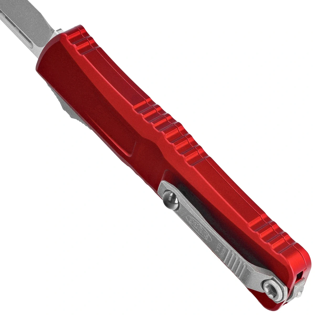 Rękojeść - wykonana z doskonałą precyzją w technologii 3D na frezarkach CNC, z pokrytego powłoką Mil-Spec aluminium 6061-T6. Faktura powierzchni rękojeści oraz głębokie nacięcia (jimping) na niej sprawiają, że nóż nie ślizga się w dłoni podczas używania. Smukły profil oraz frezowany dwupozycyjny (prawa/lewa) masywny klips typu deep carry, umożliwiają dyskretne przenoszenie noża w kieszeni, w pozycji tip-down (czubkiem ostrza do dołu). Wyposażony w gładką kulkę rollerball, dzięki której nóż z łatwością wsuwa się do kieszeni nie niszcząc brzegów kieszeni. Na klipsie znajduje się logo Microtech i data produkcji. Rękojeść zakończono zbijakiem do bicia szyb, stalowy trójkąt, w który wprasowano kulkę z węglika wolframu.