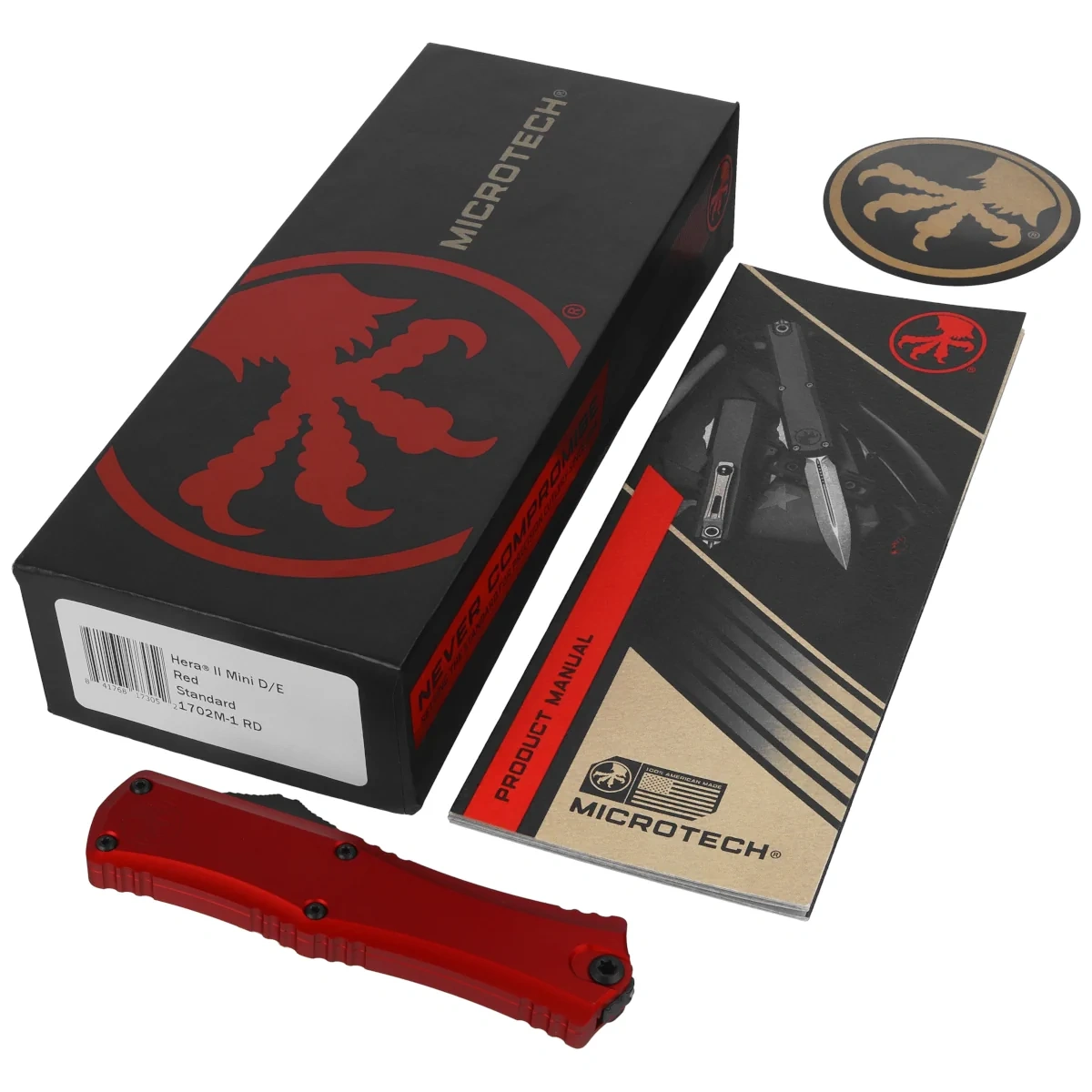 - Hera 2 Mini D/E Red Aluminium, Black kompaktowa wersja jednego z najlepszych noży OTF inpirowana modelem Troodon. Lekki i wygodny w przenoszeniu, przy zachowaniu mocy oraz osiągów większych modeli. Projekt A. Marfione właściciela Microtech Knives.