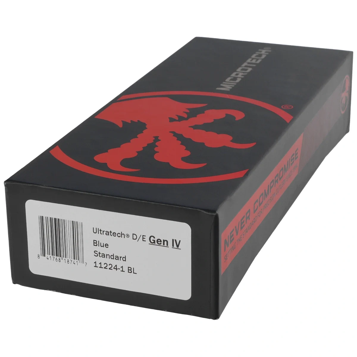 Ultratech Gen IV D/E Blue Aluminium, Black to pełnowymiarowy nóż automatyczny OTF (Out The Front) z serii Ultratech. Czwarta generacja wyróżnia się szeregiem usprawnień, takich jak; Crud Kutter™, Dual-Fuel Drive Train™. Przeprojektowano również rękojeść, wyposażając ją w rozwiązania znane z innych modeli. Pracujący w trybie D/A (Double Action), umożliwia błyskawiczne wysunięcie i schowanie ostrza za pomocą jednego ruchu kciuka. Projekt autorstwa Tony’ego Marfione, właściciela Microtech Knives, łączy w sobie nowoczesny design z najwyższą jakością wykonania.