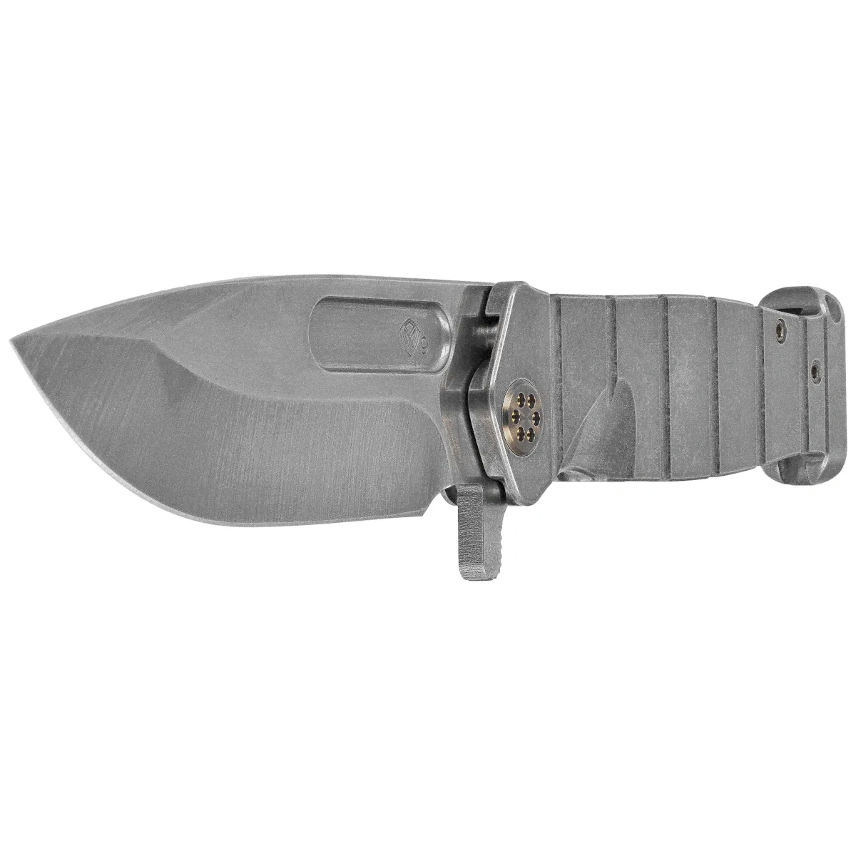 Rękojeść z tytanu, również wykończona maszynowo metodą „tumbled", strona blokady anodyzowana na niebiesko. Masywna głowica z tyłu rękojeści odpowiada za balans i wyważenie, może również służyć jako improwizowany młotek lub zbijak do szyb. Całości dopełnia unikalny w formie klips, oczywiście również z tytanu. Śruby, głowica i klips barwione na kolor brązu pięknie kontrastują z szarą rękojeścią.
