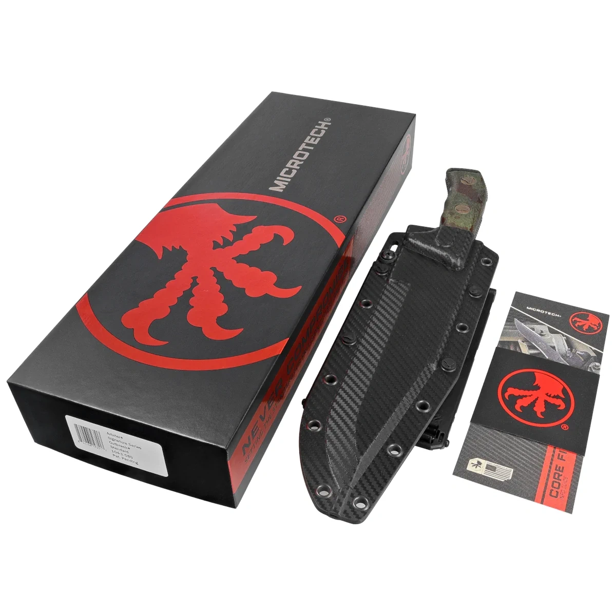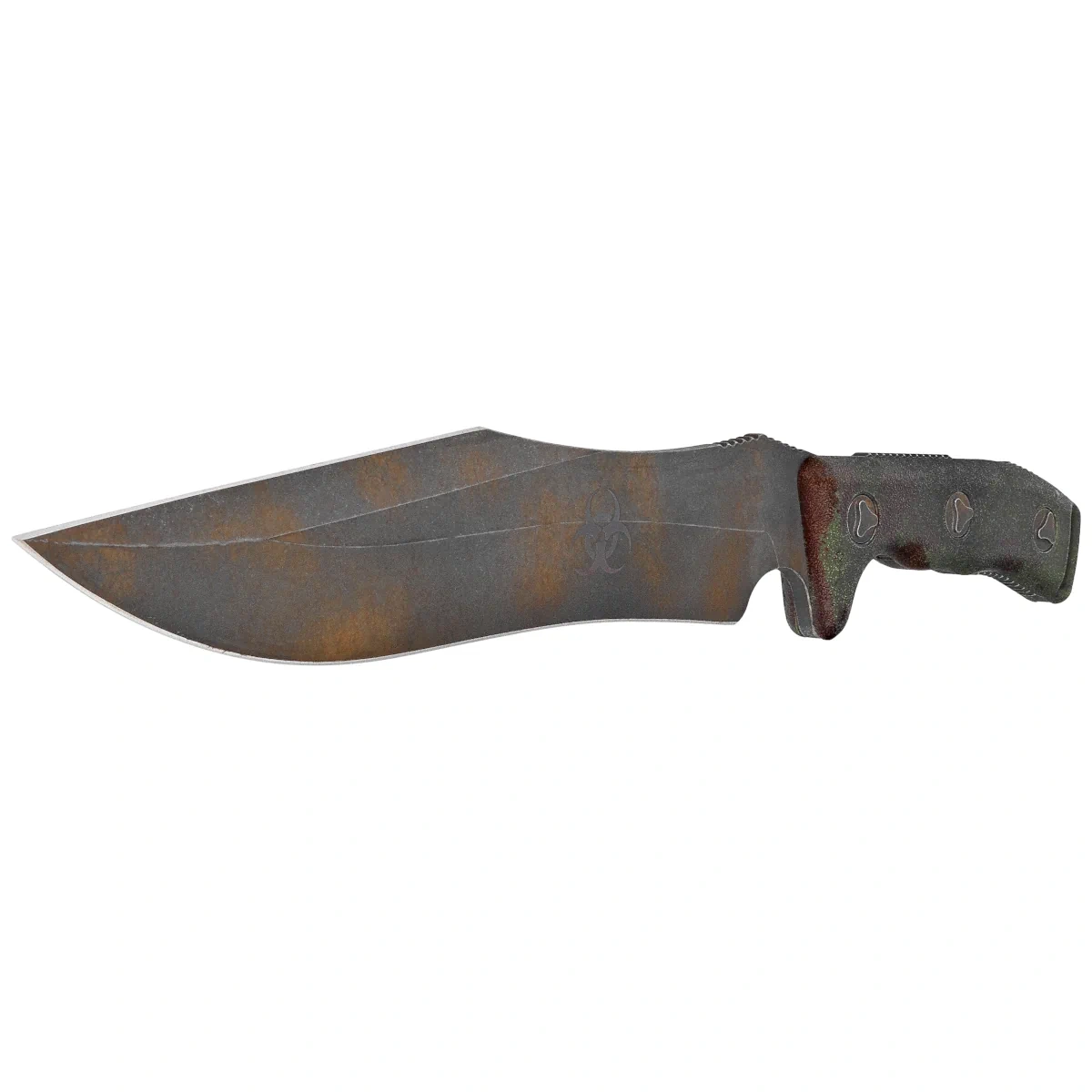 Głownia - szlifowane maszynowo długie ostrze typu S/E (Single Edge Clip Point) Bowie, pokryta powłoką Outbreak. Mimo grubości, szlif płaski (Flat Grind) zapewnia doskonałe właściwości tnące połączone ze znakomitą wytrzymałością. Duży choil na początku krawędzi tnącej zapewnia miejsce na palec przy precyzyjnym uchwycie. Na klindze znajduje się logo firmy Microtech oraz numer seryjny i data produkcji. Długie fałszywe ostrze w połączeniu z masą noża zapewnia imponujące możliwości przebijania. Na grzbiecie ostrza karbowanie pod palec.