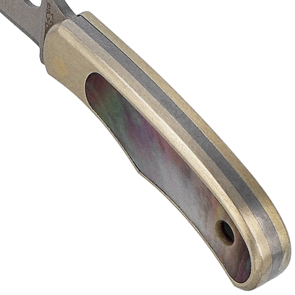 Rękojeść - wykonana z wytrzymałego, odpornego na działanie wysokich i niskich temperatur, środków chemicznych mosiądzu, ozdobionego wkładkami z muszli. Okładziny przymocowano do solidnej podkładki dystansowej (tzw. backspacer / łącznik okładzin rękojeści), która zapewnia wytrzymałość konstrukcji. W tylnej części chwytu otwór (lanyard hole) do mocowania linki zabezpieczającej lub łańcuszka kulkowego do zawieszenia noża na szyi lub dopięcia do key-ringa / o-ringa / breloka z kluczami.