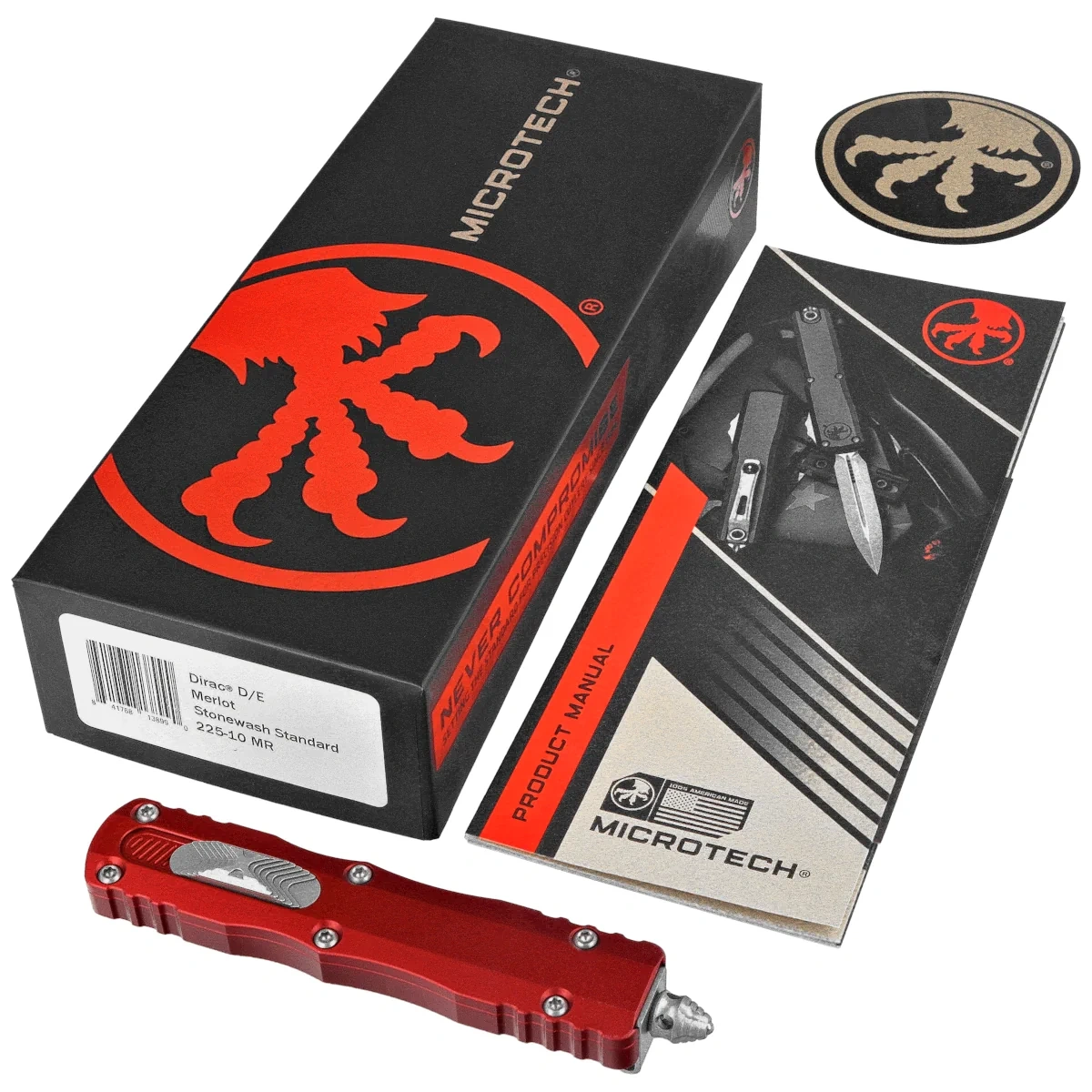 - Dirac D/E Merlot Aluminum, Stonewashed to kompaktowy nóż automatyczny OTF z serii Dirac. Pracujący w trybie D/A, wyposażony w piekielnie szybki mechanizm wysuwający ostrze. Przycisk slidera na boku rękojeści. Projekt Tony Marfione z Microtech Knives