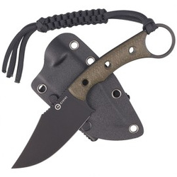 Midwatch Black Micarta, Black Stonewashed, a small EDC knife with a fixed blade. The thoroughly utilitarian shape of the blade made of N690 steel, handle made of burlap micarta, sheath made of kydex, equipped with a T-Clip allowing attachment to the belt.