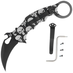The Skull Karambit Black Aluminum, Black Folding Karambit for everyday use and for duty. Black coated blade with hawk bill profile made of Bohler N690Co steel, comfortable aluminum handle. Three methods for quick opening of the blade and a proven lock!