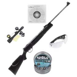 FLASH 101 SET, a modern PCP air rifle at a great price! Includes PCP pump, Optima 4x32 scope with mount, two magazines, compensator, rail mount with bipod, carrying case, pack of shotgun shells. Precision 17.7" barrel ending with ½" UNF male threads